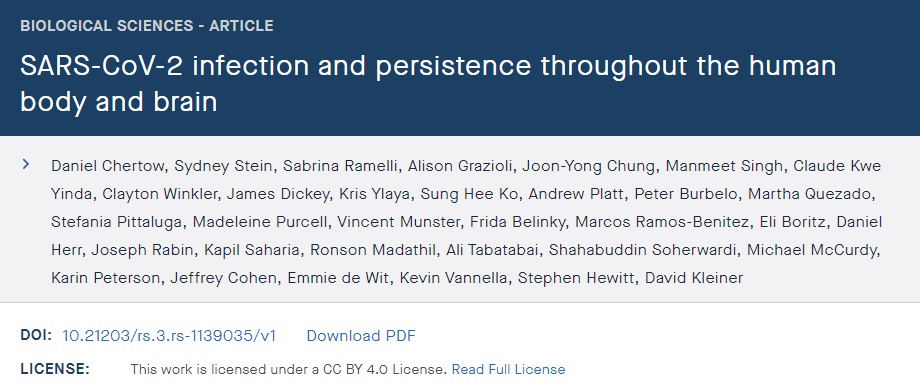 美国NIH领导的一项研究,对44例感染COVID-19后死亡的患者进行了完整的全身和脑取样的尸检,证明即使是无症状感染者和轻症感染者体内也广泛分布着SARS CoV-2病毒,病毒全身性的复制能够发生在感染早期。发病后,病毒RNA在肺外组织和大脑内续存最长超过230天。