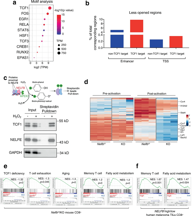 后续的ATAC-seq分析还表明,Nelfbf/f和KO CD8+ T细胞有着不同的染色质开放状态,Nelfb敲除后的染色质可及性降低。在Nelfb KO破坏可及性的染色质区域中,TCF1结合域是最显著富集的基序。数据显示,NELF被优先招募到TCF1靶基因的增强子和启动子(图3)。邻近标记分析显示,NELF与TCF1在物理空间上 非常接近。值得注意的是,基因集富集分析(GSEA)显示Nelfb缺失与TCF1缺乏、T细胞耗竭和衰老特征的富集基因特征相关。这些数据表明,NELF促进了TCR触发的转录,继而有利于记忆T细胞的命运并减轻T细胞耗竭和衰老。