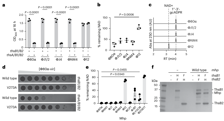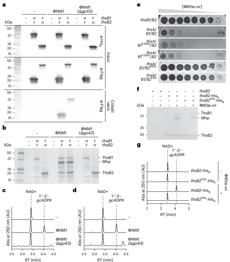 本研究揭示了Thoeris系统通过识别噬菌体主要衣壳蛋白(Mhp)激活细菌免疫的新机制。研究人员发现金黄色葡萄球菌ThsB1/ThsB2传感器与Mhp形成三元复合物,催化生成1"-3'-gcADPR信号分子,进而激活ThsA效应蛋白降解NAD+限制病毒增殖。该发现不仅阐明了原核生物TIR结构域识别病毒结构的保守机制,还为理解病毒衣壳结构多样性进化提供了新视角。