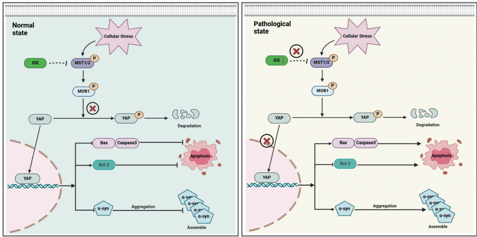 本研究针对帕金森病(PD)中α-突触核蛋白(α-syn)异常聚集的病理机制,探讨了胰岛素降解酶(IDE)的神经保护作用及分子机制。研究人员通过体内外实验发现,IDE表达下调加剧α-syn病理损伤,而过表达IDE可通过抑制Hippo信号通路核心激酶MST1/2,显著改善运动功能障碍并保护多巴胺能神经元。该研究揭示了IDE-Hippo轴在PD中的关键作用,为开发新型治疗策略提供了理论依据。