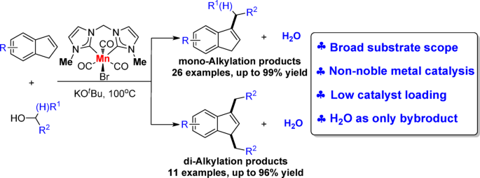 成功开发了一种由双(NHC)锰催化剂催化的苯基烷基化方法,该方法能够便捷地对多种芳烃进行烷基化处理。这种创新方法能够高效合成各种烷基化的芳烃,包括形式上的sp² C3-单烷基化茚、sp³ C1、sp² C3-双烷基化茚以及其他sp³ C–H烷基化芳烃,所有这些产物均可从常见的伯醇和仲醇制备获得。该烷基化反应的核心是双(NHC)锰催化剂,它在促进简单醇类转化为复杂且具有价值的有机化合物的过程中起着关键作用。