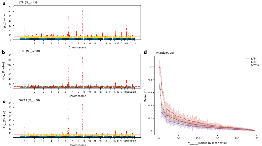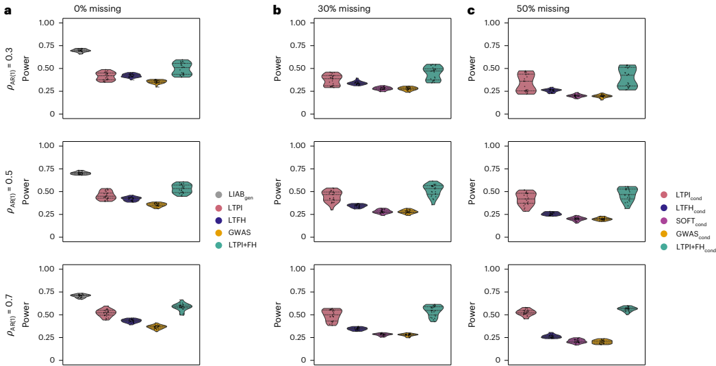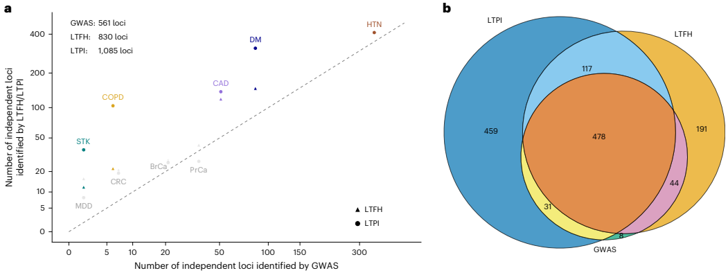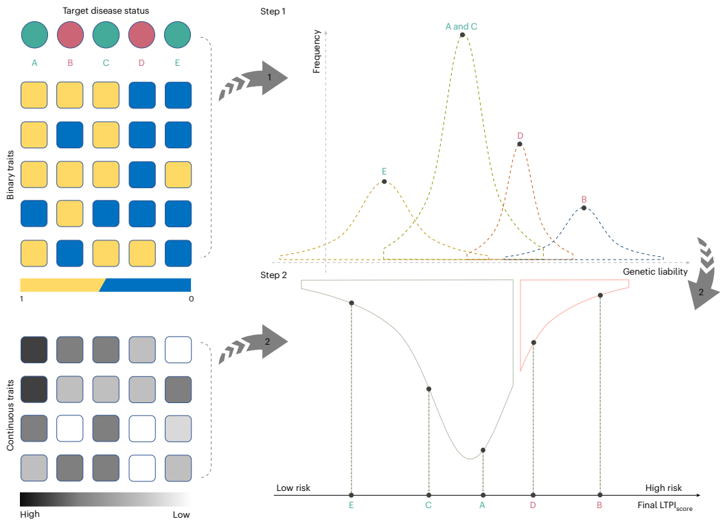 本研究针对电子健康记录(EHR)中病例-对照标签定义不精确、统计效能有限的问题,提出了责任阈值表型整合(LTPI)方法。该方法通过整合诊断代码、家族史、实验室测量值等二元/连续表型,结合遗传相关性估计,构建连续疾病风险评分。在eMERGE和UK生物样本库的应用表明,LTPI较传统PheCodes、LTFH和SoftImpute方法显著提升疾病风险预测准确性(R2达0.674)和GWAS检测功效(位点发现数增加172%),为EHR数据的精准医学应用提供新范式。