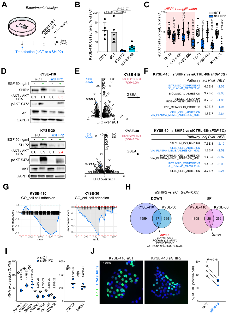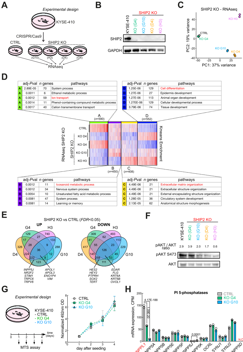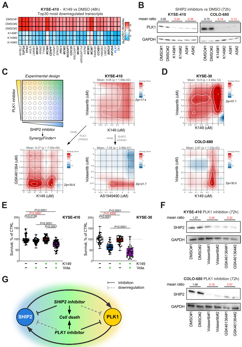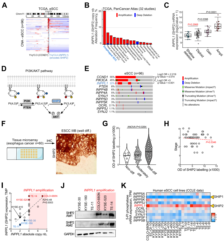 本研究针对食管鳞状细胞癌(eSCC)治疗耐药难题,发现INPPL1基因扩增导致SHIP2过表达并通过PI3K/AKT通路促进肿瘤生长。研究人员通过SHIP2敲降和药物抑制实验,证实其调控eSCC细胞存活/增殖的关键作用,并首次揭示SHIP2抑制可下调PLK1表达,双重抑制SHIP2与PLK1产生显著协同效应,为eSCC靶向治疗提供新策略。