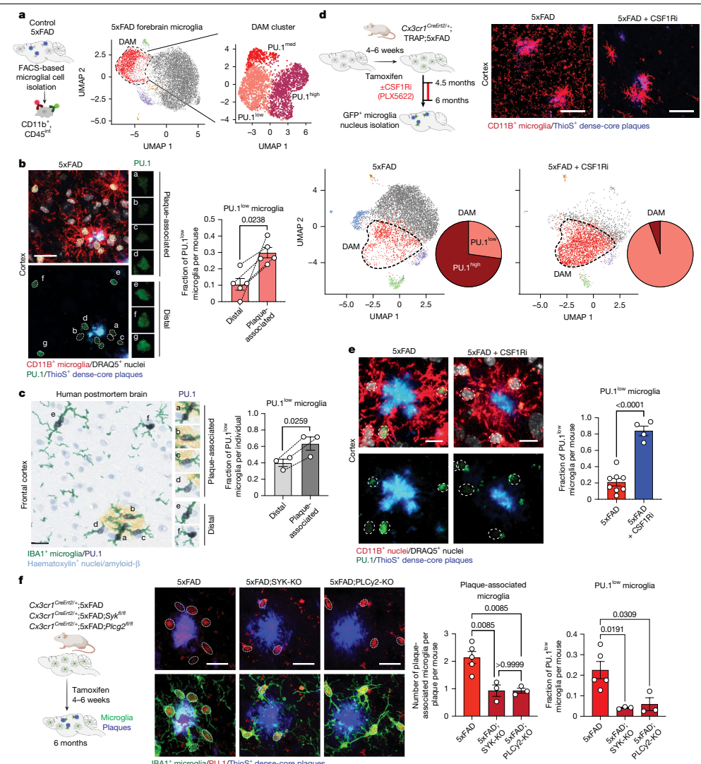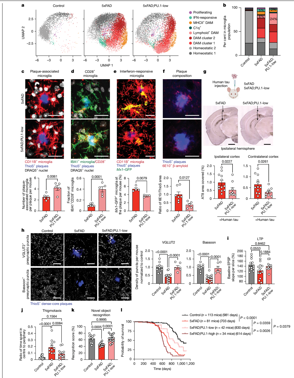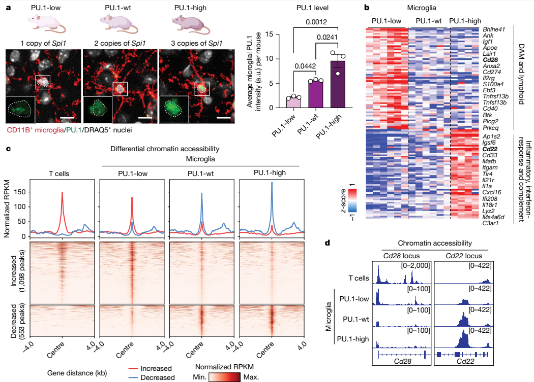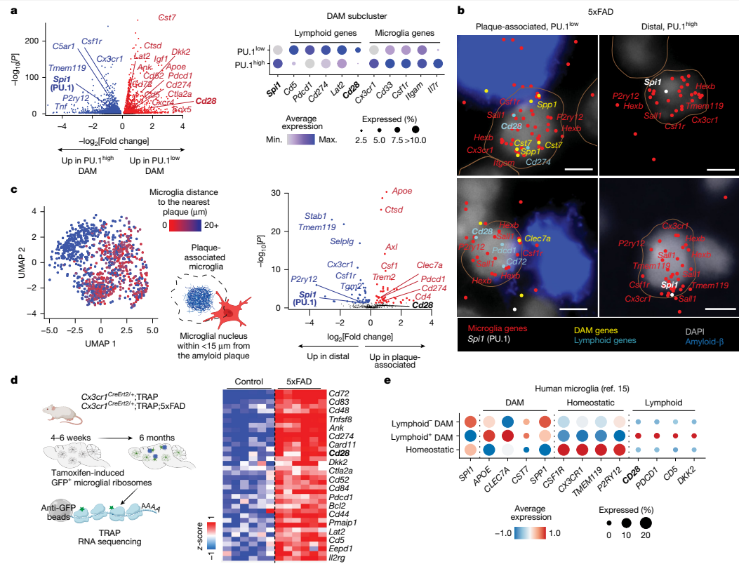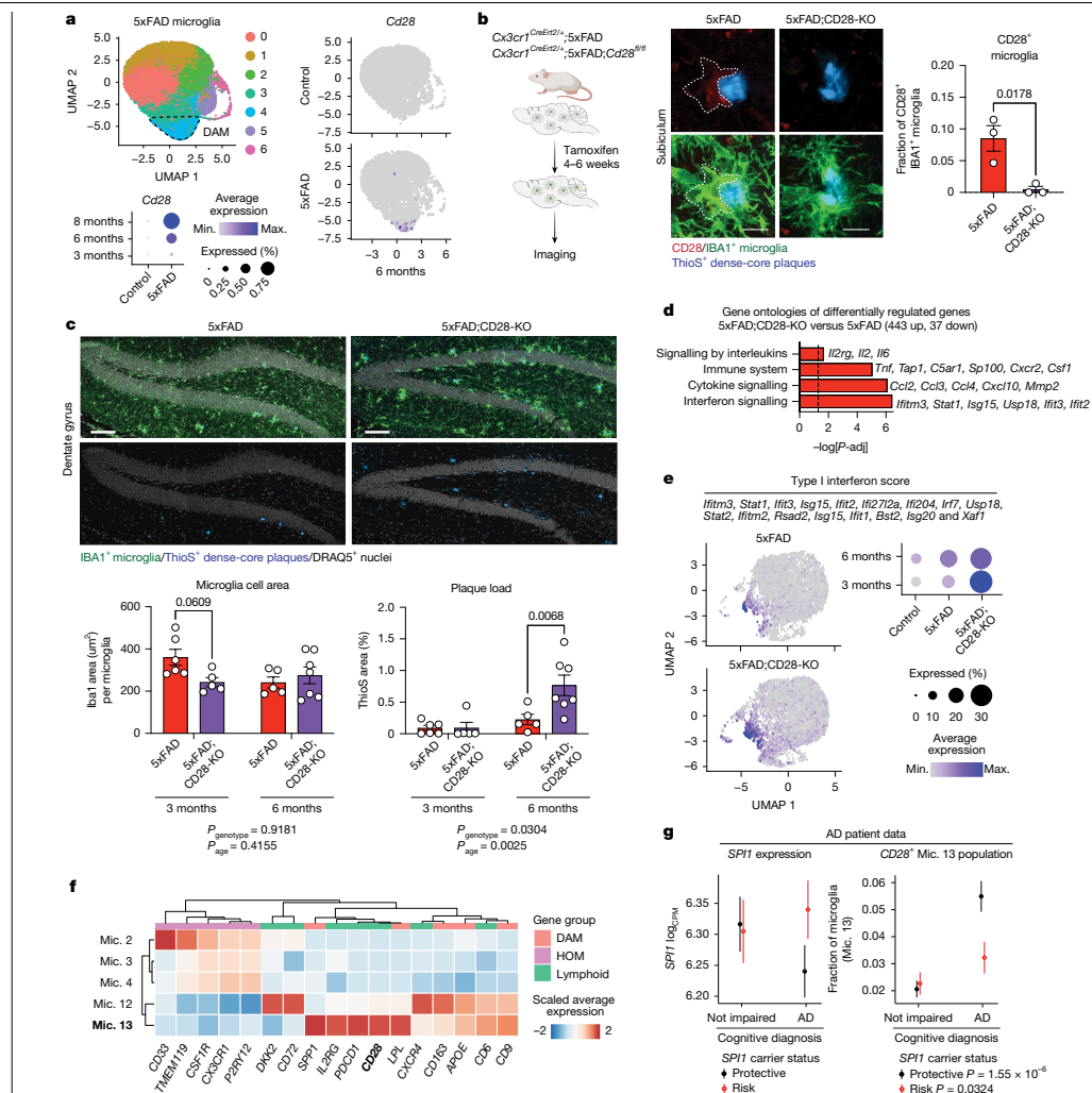 本研究针对阿尔茨海默病(AD)中小胶质细胞功能失调的关键问题,通过单细胞测序、空间转录组学和基因编辑技术,首次发现PU.1转录因子下调可诱导小胶质细胞表达CD28等淋巴样受体,形成神经保护性表型。该研究揭示了PU.1lowCD28+小胶质细胞通过抑制神经炎症、促进淀粉样斑块清除和改善突触功能,显著延缓5xFAD小鼠疾病进展。这一发现为AD免疫治疗提供了新靶点。
