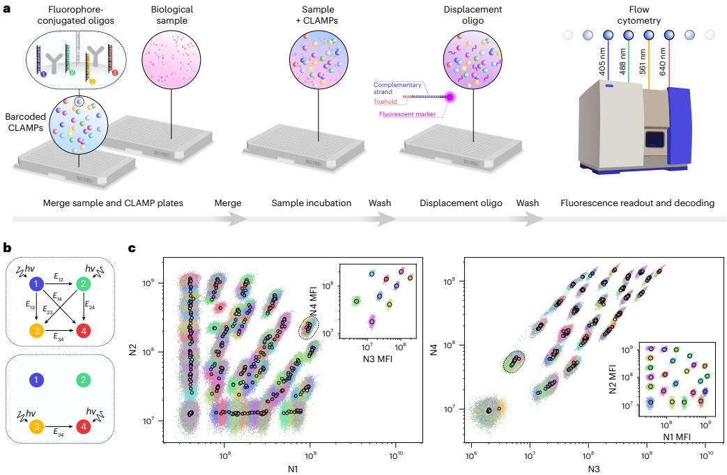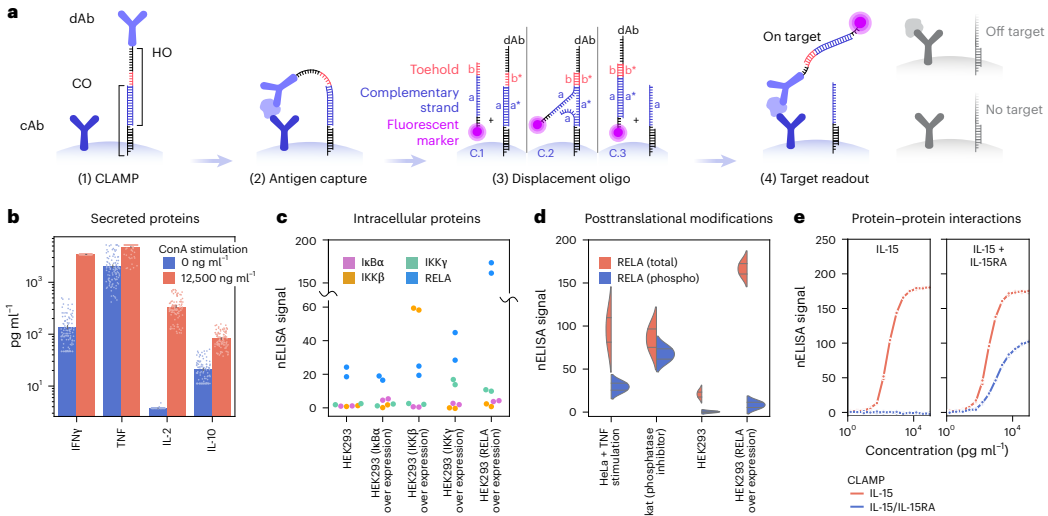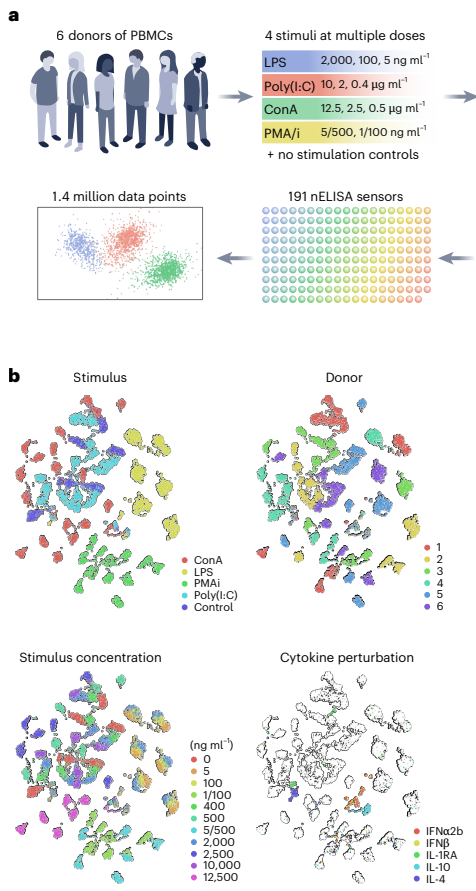 为解决现有高plex蛋白检测工具在定量准确性、精密度和成本效益方面的不足,研究人员开发了nELISA平台。该技术通过DNA介导的微珠夹心免疫分析法结合多色微珠条形码技术,成功构建191-plex炎症因子检测面板,在7,392个PBMC样本中生成140万组蛋白测量数据,灵敏度达亚皮克/毫升级,为大规模表型筛选提供了高效解决方案。