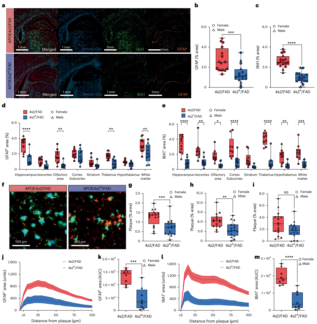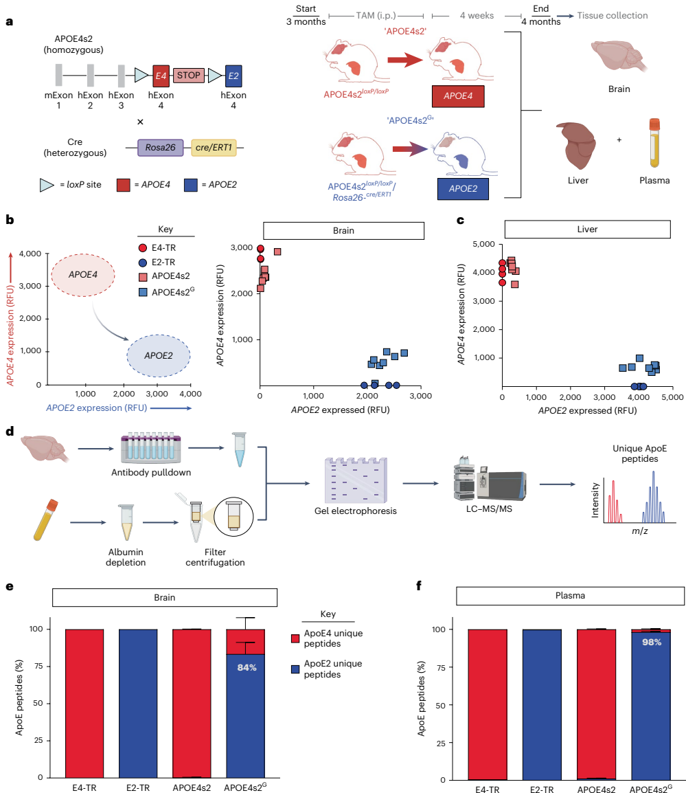 本研究针对APOE4作为晚发型阿尔茨海默病最强遗传风险因子而APOE2具有显著保护作用这一关键科学问题,开发了可诱导的APOE4向APOE2转换的小鼠模型(APOE4s2)。研究人员通过全身性和星形胶质细胞特异性等位基因转换,证实即使短期转换也能驱动AD相关的脂质组和单细胞转录组改变,特别是在星形胶质细胞中。当与5xFAD模型杂交时,星形胶质细胞特异性E4向E2转换可改善认知、减少淀粉样蛋白病理、降低胶质增生和斑块相关载脂蛋白E。这些发现为APOE基因编辑治疗策略提供了重要临床前证据。