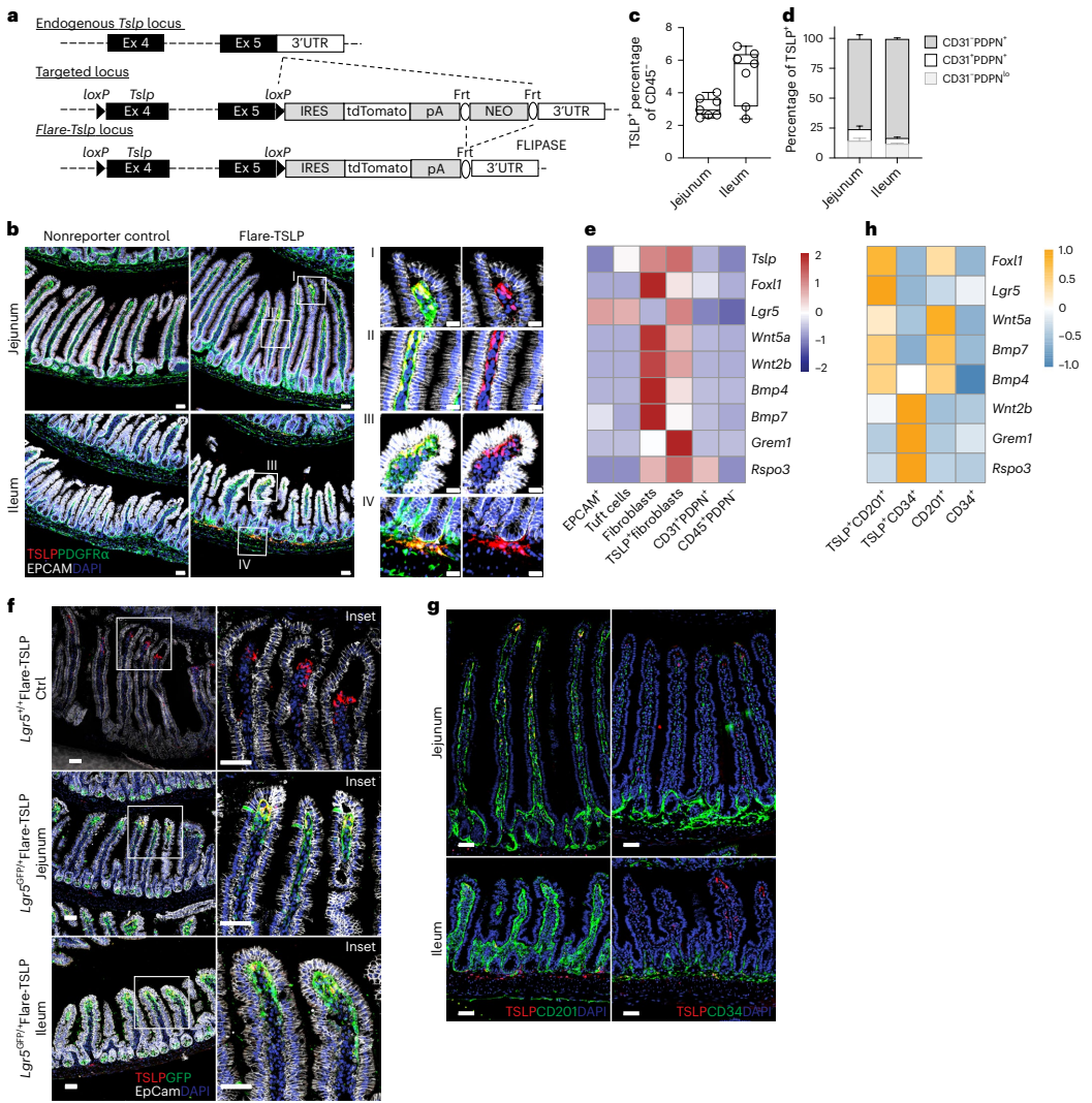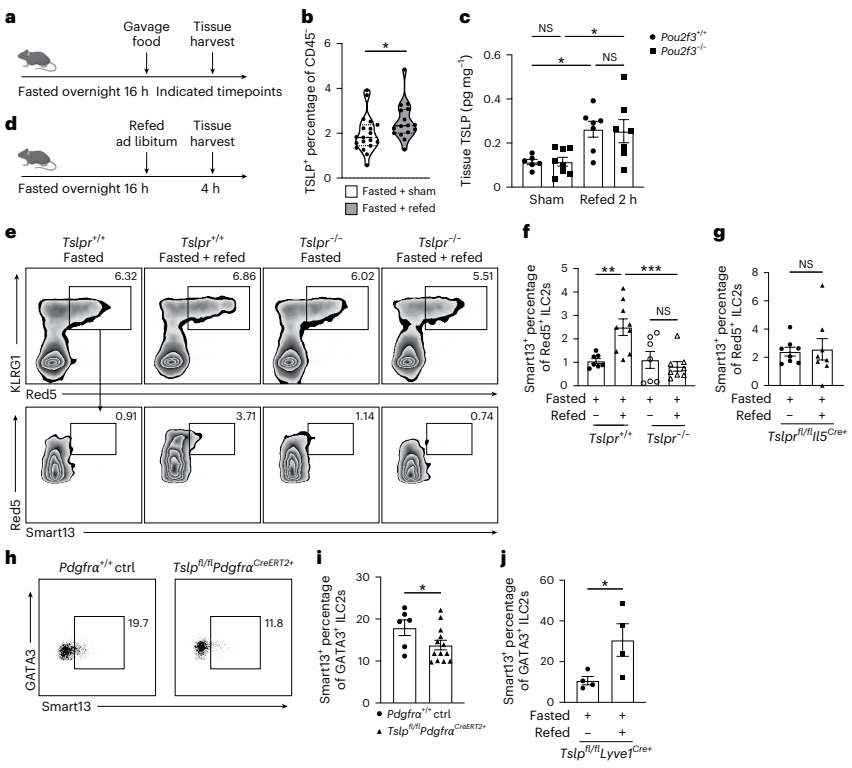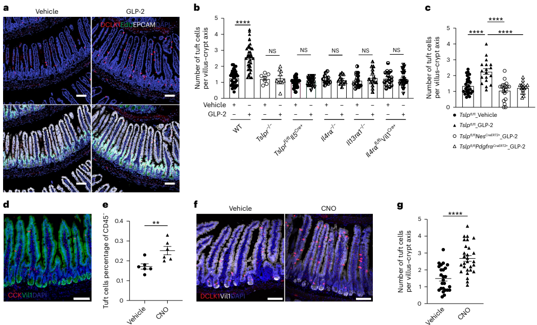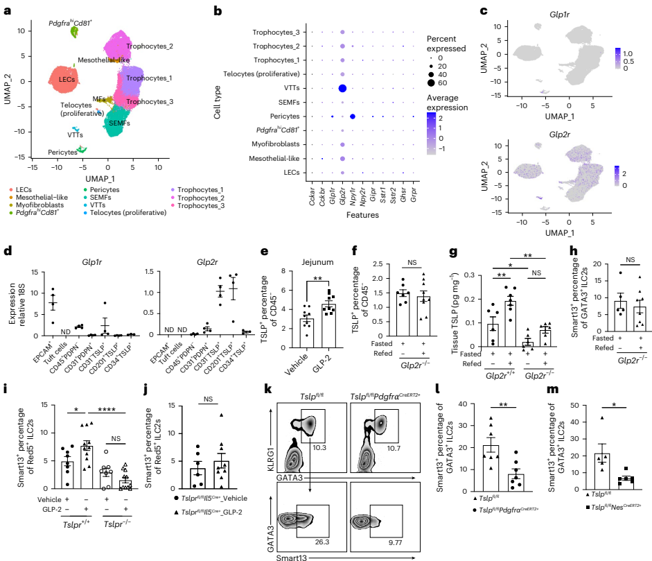 本研究揭示了肠道营养感应与2型天然淋巴细胞(ILC2)激活的新机制。研究人员发现肠上皮下成纤维细胞(包括telocytes和trophocytes)持续表达胸腺基质淋巴细胞生成素(TSLP),进食后通过肠内分泌细胞(EECs)释放的胰高血糖素样肽-2(GLP-2)激活该通路,促进TSLP依赖性ILC2活化和簇细胞增生,从而将营养检测与上皮监视机制相连接。这项发表于《Nature Immunology》的研究为理解肠道稳态调控提供了新视角。