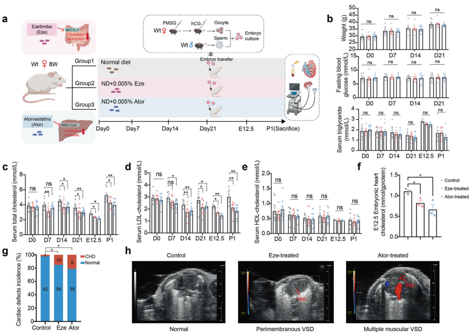 本研究针对母体胆固醇水平与子代先天性心脏病(CHD)风险的关联机制这一临床难题,通过人群队列、基因编辑动物模型和分子机制实验,首次发现CYP51A1基因I383V突变可通过破坏胆固醇合成,抑制Hedgehog(Hh)信号通路与纤毛发生,导致心脏发育异常;而母体高胆固醇饮食可有效逆转遗传缺陷引发的CHD风险,为CHD的早期防治提供了新的靶点和干预策略。