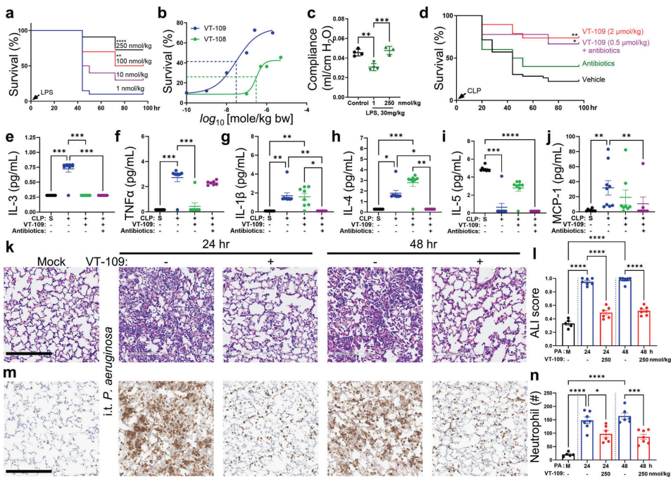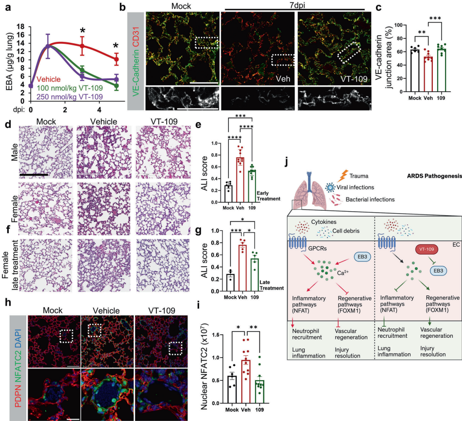 本研究针对急性呼吸窘迫综合征(ARDS)缺乏靶向药物治疗的临床困境,开发了新型EB3抑制剂VT-109。研究人员通过NMR引导的合理化设计优化先导化合物,证明VT-109可有效阻断EB3-IP3R3相互作用,抑制病理钙信号传导,同时激活FOXM1依赖性内皮修复程序。在多种临床前ARDS模型(内毒素血症、脓毒症、SARS-CoV-2肺炎等)中,VT-109能快速恢复血管屏障功能、减轻肺水肿、改善肺部结构和功能,显著降低病死率。该研究为ARDS治疗提供了具有广阔治疗时间窗的创新策略。