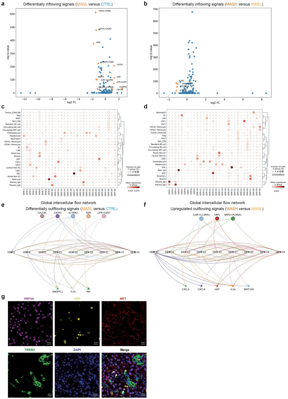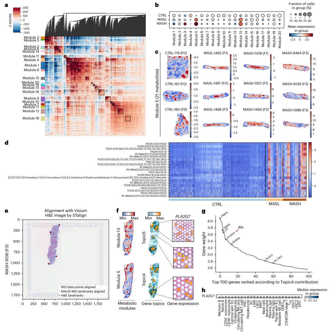 本研究通过单细胞转录组、空间转录组和空间代谢组等多组学技术,对61例人类代谢功能障碍相关脂肪性肝病(MASLD)样本进行系统性分析。研究人员发现微眼转录因子(MITF)是脂质相关巨噬细胞(LAMs)脂质处理能力的关键调控因子,并揭示LAMs通过肝细胞生长因子(HGF)分泌发挥肝保护作用。空间转录组分析识别出晚期MASH富集的纤维化相关基因程序,质谱成像技术进一步证实MASLD特异性磷脂积聚与Lp-PLA2介导的磷脂代谢相关。该研究为MASLD机制研究和治疗策略开发提供了宝贵资源。
