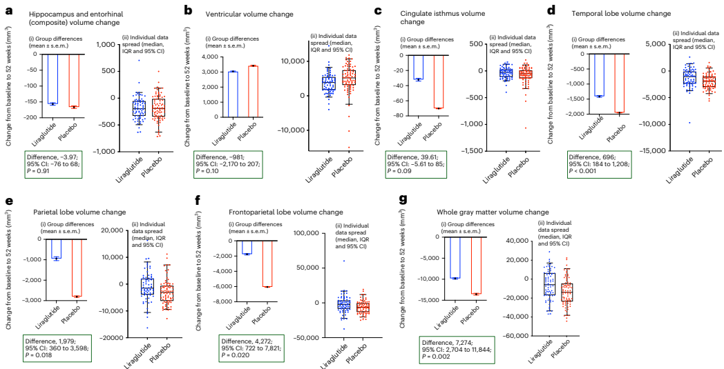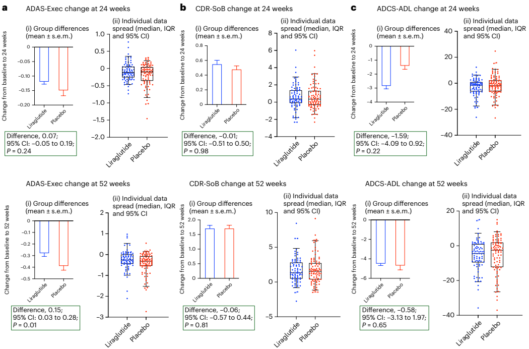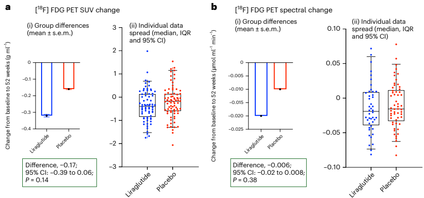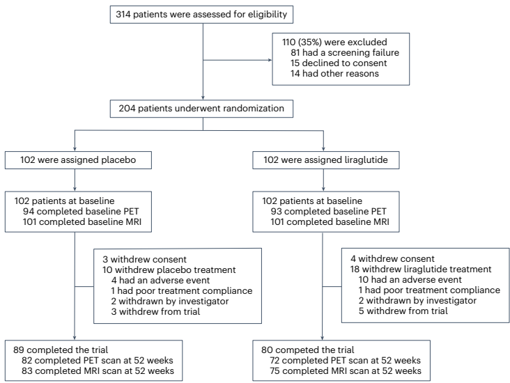 本研究针对阿尔茨海默病(AD)多病理机制的特点,开展了为期52周的多中心随机双盲安慰剂对照IIb期临床试验(ELAD),评估GLP-1受体激动剂利拉鲁肽对204例非糖尿病轻中度AD患者的安全性和有效性。结果显示虽然脑葡萄糖代谢(主要终点)无显著改善,但利拉鲁肽组在ADAS-Exec认知评分上表现出显著优势(P=0.01),且MRI显示全脑灰质体积减少减缓(P=0.002)。研究表明利拉鲁肽可能通过神经保护机制延缓AD病程进展,为GLP-1类似物在神经退行性疾病领域的应用提供了重要临床证据。