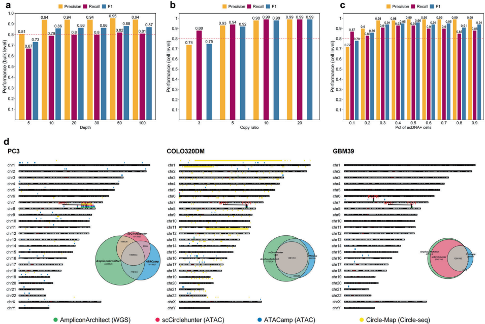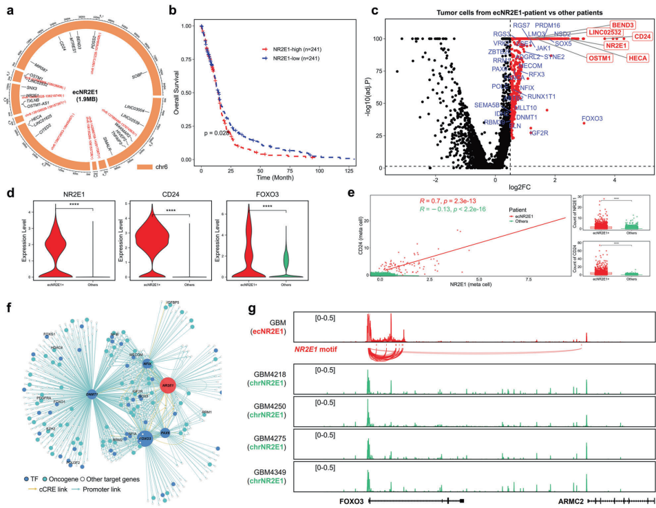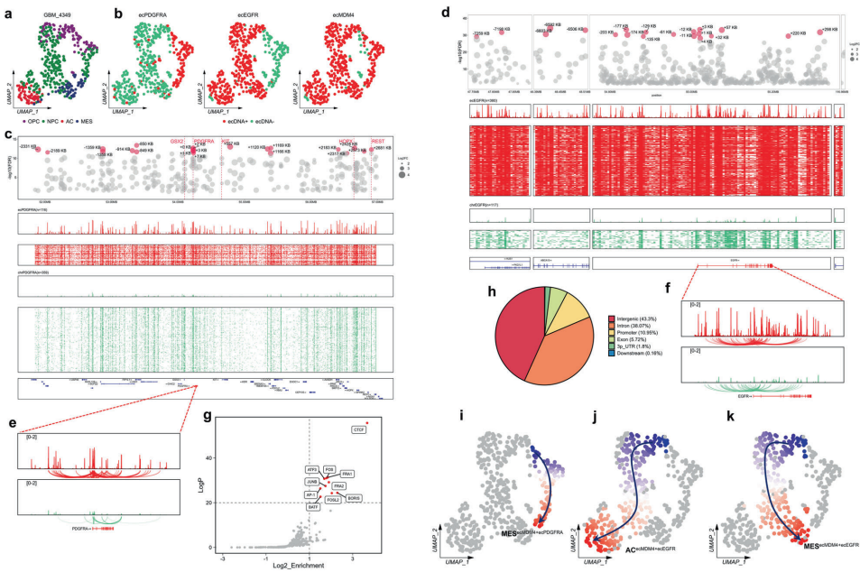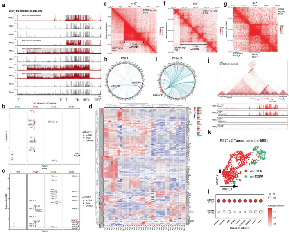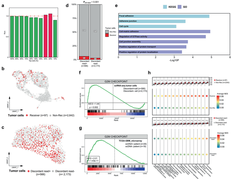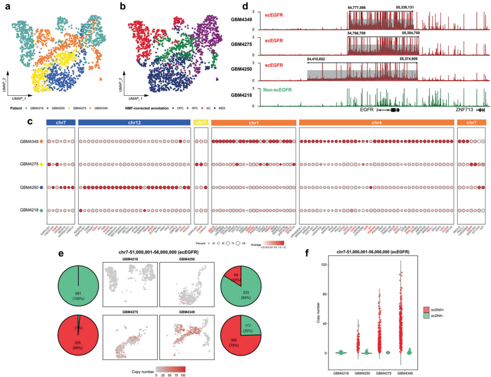 本研究针对肿瘤异质性中ecDNA(染色体外DNA)在单细胞分辨率研究不足的问题,开发了scCirclehunter计算框架,首次实现从scATAC-seq数据中识别ecDNA并将其精准分配至特定细胞群。通过分析胶质母细胞瘤(GBM)数据,发现ecDNA携带细胞在患者间和肿瘤空间区域间存在显著异质性,揭示ecDNA通过调控网络重编程(如ecNR2E1驱动FOXO3/CD24通路)和线粒体劫持等新机制促进肿瘤进展。该研究为理解ecDNA驱动肿瘤异质性提供了单细胞精度的新范式。