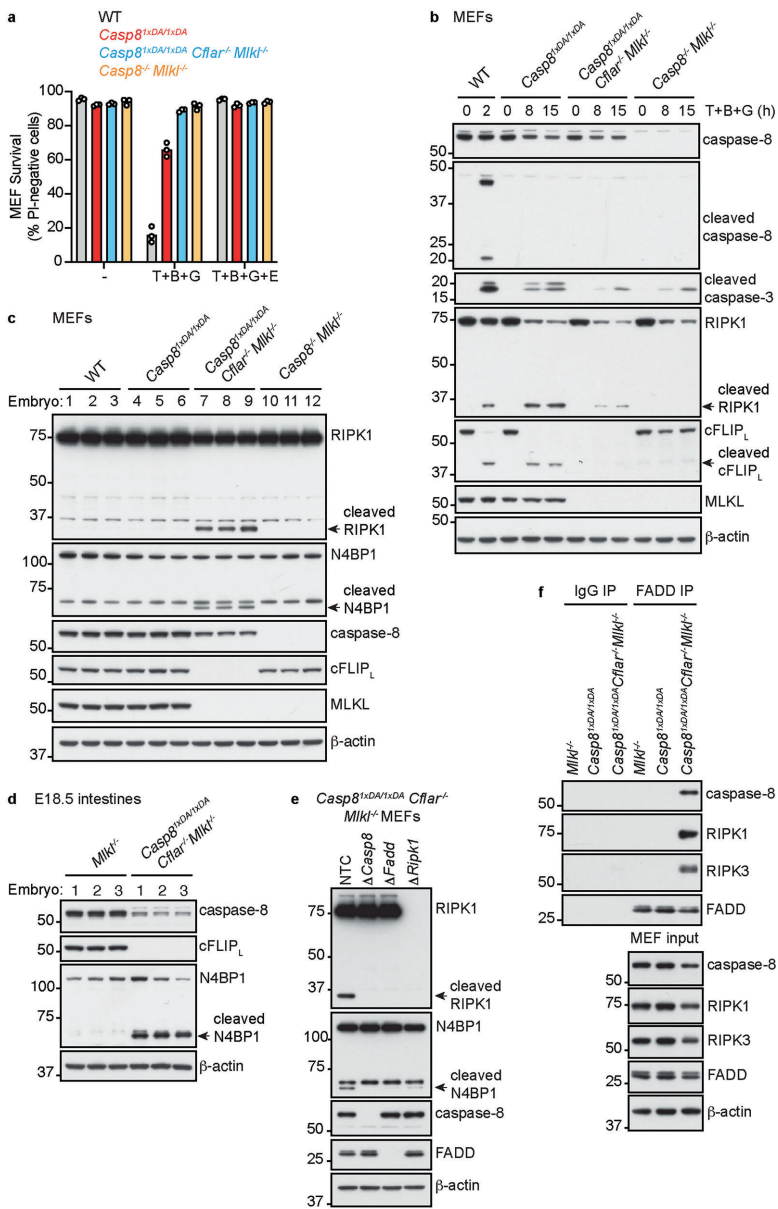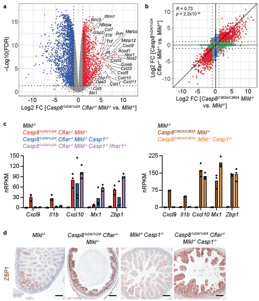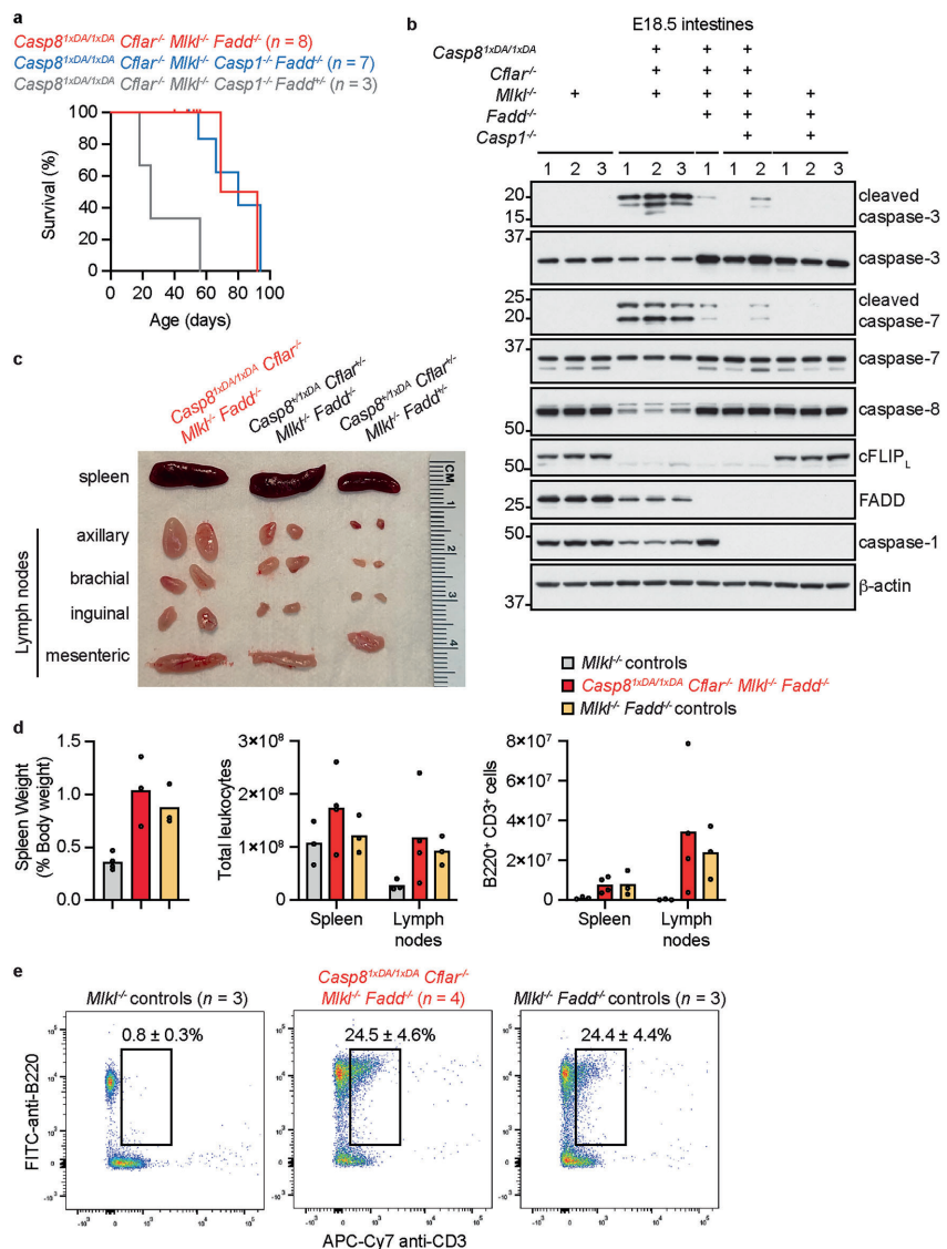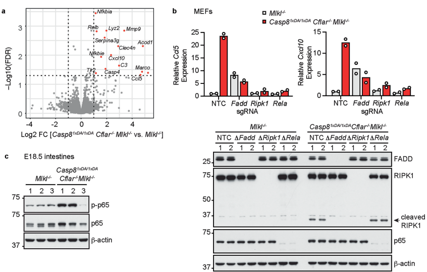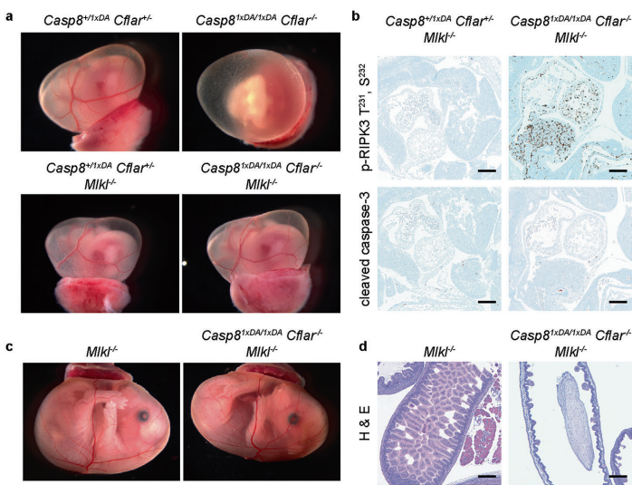 本研究针对自剪切缺陷型caspase-8 D387A突变体在cFLIP缺失背景下引发围产期死亡的机制展开探索。研究人员通过构建多基因敲除小鼠模型,发现caspase-8 D387A与cFLIP形成的异源二聚体可介导外源性凋亡,而cFLIP缺失导致caspase-8 D387A同源二聚体异常激活FADD-RIPK1信号轴,进而触发caspase-1非依赖性的肠道萎缩和炎症基因表达。该研究揭示了cFLIP在平衡caspase-8同源/异源二聚体功能中的关键作用,为自身免疫及肠道疾病治疗提供新靶点。