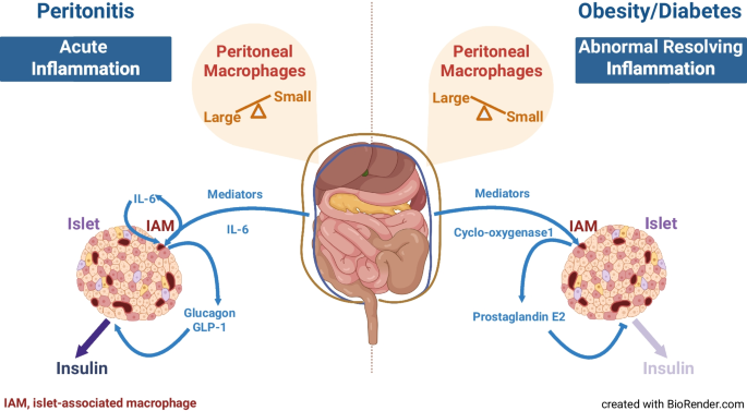胰岛相关巨噬细胞与胰腺外巨噬细胞协调作用,以调节葡萄糖稳态和胰岛素分泌。特别是,腹腔巨噬细胞群的重塑足以促进急性炎症的益处,而炎症反应的异常消退可能有助于2型糖尿病中β细胞的衰竭。