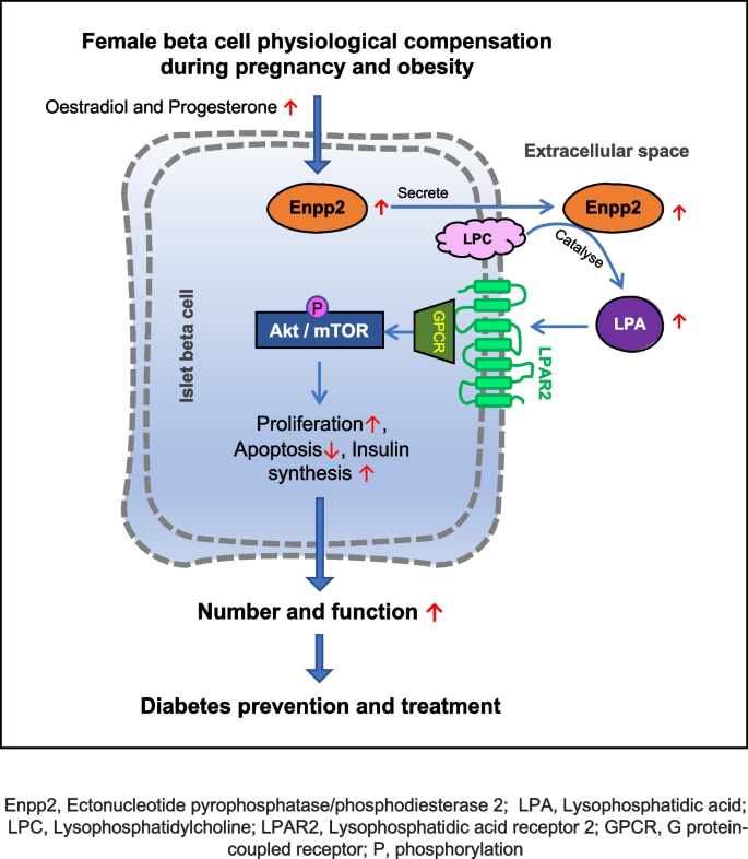 ENPP2通过促进β细胞增殖、抑制凋亡及增强胰岛素分泌,在肥胖和妊娠期β细胞补偿中起关键作用,其机制涉及LPA-Akt/mTOR信号通路,并可能成为糖尿病治疗的新靶点。