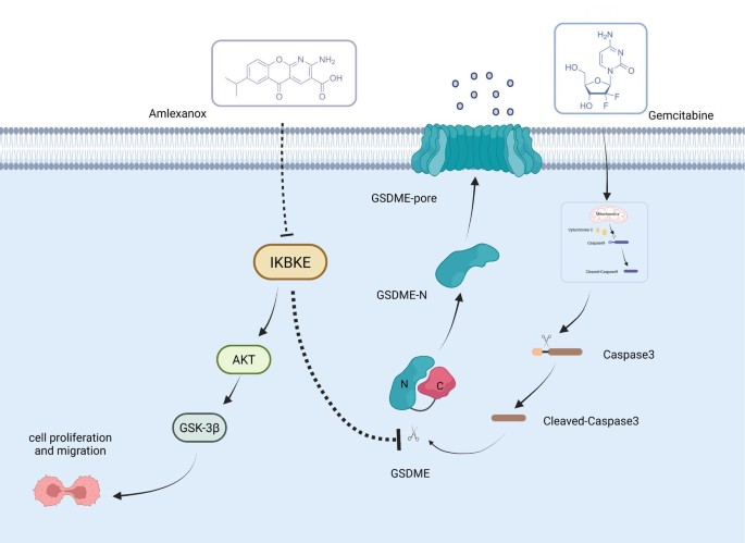 胰腺导管腺癌(PDAC)对吉西他滨(GEM)治疗抵抗的研究。发现IKBKE通过磷酸化GSDME Thr6抑制caspase-3介导的pyroptosis,导致化疗耐药。敲低或抑制IKBKE可增强GEM敏感性,促进免疫原性细胞死亡。临床数据显示IKBKE高表达与PDAC患者预后不良相关。动物和患者来源的肿瘤器官模型验证了靶向IKBKE(如使用amlexanox)逆转GEM耐药的潜力。