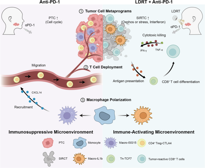 抗PD-1(αPD-1)疗法在头颈部鳞状细胞癌(HNSCC)中的疗效有限,部分原因是由于肿瘤微环境(TME)具有免疫抑制作用以及效应T细胞浸润不足。低剂量放疗(LDRT)被认为可以改变TME,从而可能增强αPD-1的效果。
