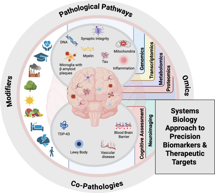 阿尔茨海默病(AD)是一种进行性且最终致命的神经退行性疾病,是最常见的痴呆类型,影响了美国近700万人。一个多世纪以来,研究重点一直集中在AD的标志性病理变化上——细胞外的β-淀粉样蛋白(Aβ)斑块和由过度磷酸化的tau蛋白(pTau)组成的细胞内神经纤维缠结。尽管这些机制对于我们理解该疾病至关重要,但驱动AD的潜在分子事件和更广泛的生物途径仍不完全清楚。针对AD及相关痴呆症(ADRD)的精准医疗需要通过病理生理生物标志物来全面了解神经退行性疾病,以实现早期检测、预测疾病进展以及评估治疗反应。系统生物学为此提供了强大的框架,利用多组学技术发现生物标志物并阐明关键的疾病途径。本综述的目的是识别并向该领域通报正在深入研究的AD/ADRD的关键途径,包括标志性病理变化、蛋白质稳态、炎症、氧化应激、葡萄糖代谢、脂质失调、神经递质系统、突触完整性、神经发生以及与共病和性别相关的途径。最后,本文还讨论了新兴的生物标志物、发现和分析工具及策略,重点介绍了与阿尔茨海默病精准医疗相关的进展。