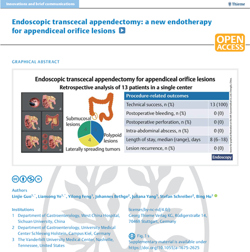 2021年12月,消化内镜中心胡兵教授团队在消化内镜领域顶级期刊Endoscopy发表了题为“Endoscopic transcecal appendectomy: a new endotherapy for appendiceal orifice lesions”的研究论文,系统总结内镜下经盲肠阑尾切除术(Endoscopic transcecal appendectomy,ETA)的操作步骤,展示了其用于阑尾病变的安全性及有效性。