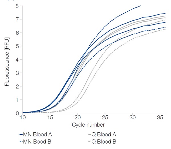 运用 NucleoSpin RNA Blood和竞争品牌Q 同时提取2个400 µL 血液样本 (Blood A, Blood B),通过RT-PCR 检测NucleoSpin RNA Blood 提取的两个RNA有着更高的得率。
