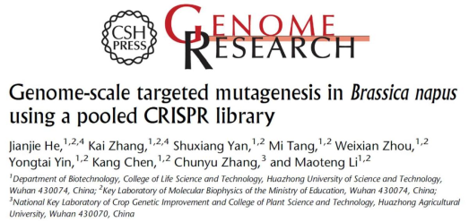 2023年6月8日,华中科技大学栗茂腾教授团队联合华中农业大学张椿雨教授团队在生物学国际权威期刊Genome Research上发表了题为Genome-scale targeted mutagenesis in Brassica napus using a pooled CRISPR library的研究论文