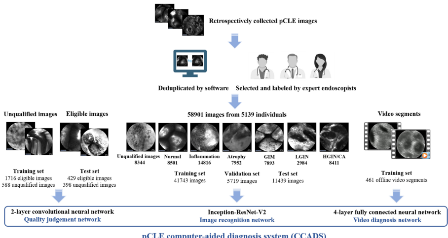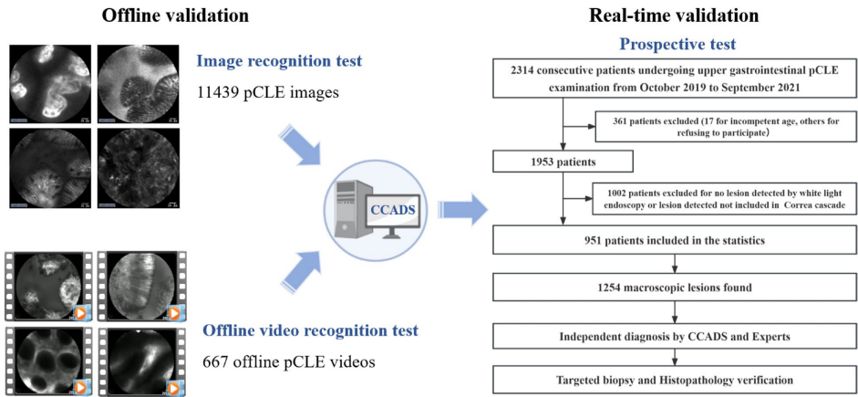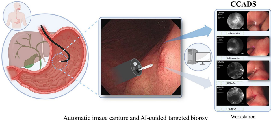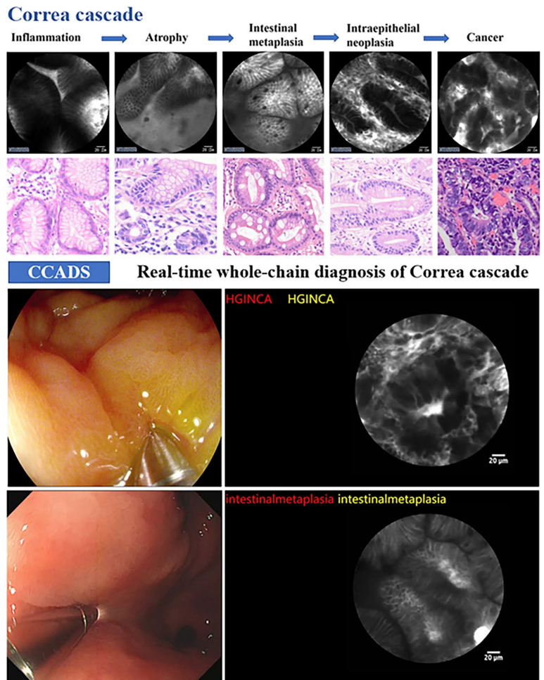为解决胃镜检查中冗余活检增加患者负担和病理医生工作量、而探头式共聚焦激光内镜(pCLE)技术又因依赖专家经验难以推广的问题,研究人员开发了pCLE计算机辅助诊断系统(CCADS),通过深度学习实现胃癌Correa级联(炎症-萎缩-肠化生-异型增生-癌)的实时全链条诊断。前瞻性研究显示,CCADS对高级别上皮内瘤变/胃癌(HGIN/CA)的敏感度达98.44%,对 neoplasms(LGIN+HGIN/CA)的诊断敏感度显著高于专家(96.70% vs. 89.01%),可有效减少肿瘤漏诊,推动光学活检的临床应用。
