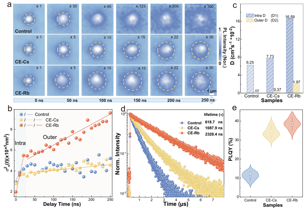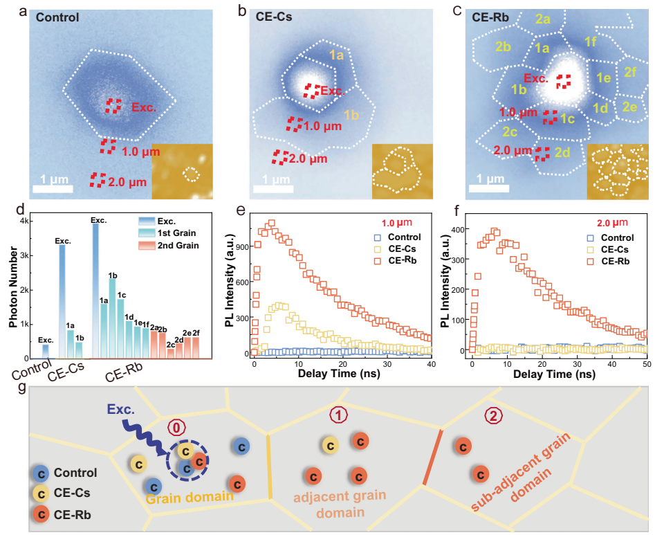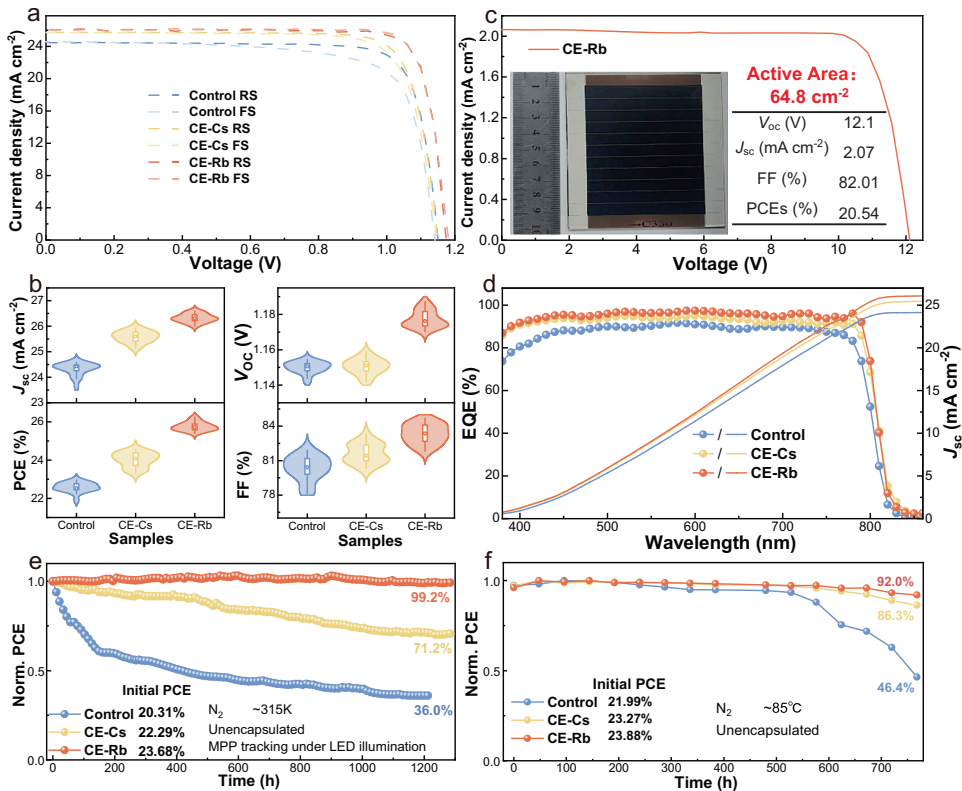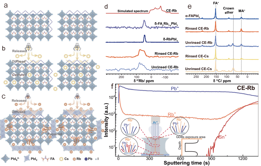 本刊推荐:针对多晶钙钛矿薄膜中晶界(GDB)载流子传输受阻这一瓶颈问题,研究团队开发了一种基于冠醚(CE)超分子缓释Rb+的原位边界桥接策略。通过固态核磁共振(NMR)、透射电镜(TEM)等技术证实Rb+在晶界处形成一维非钙钛矿相,超快时间分辨光致发光图谱显示载流子可跨越两个晶界传输。该研究使钙钛矿太阳能电池(PSCs)获得26.02%的认证效率(25.77%),并在1300小时最大功率点跟踪(MPP)下保持99.2%的初始效率,为高效稳定PSCs的规模化制备提供了新范式。