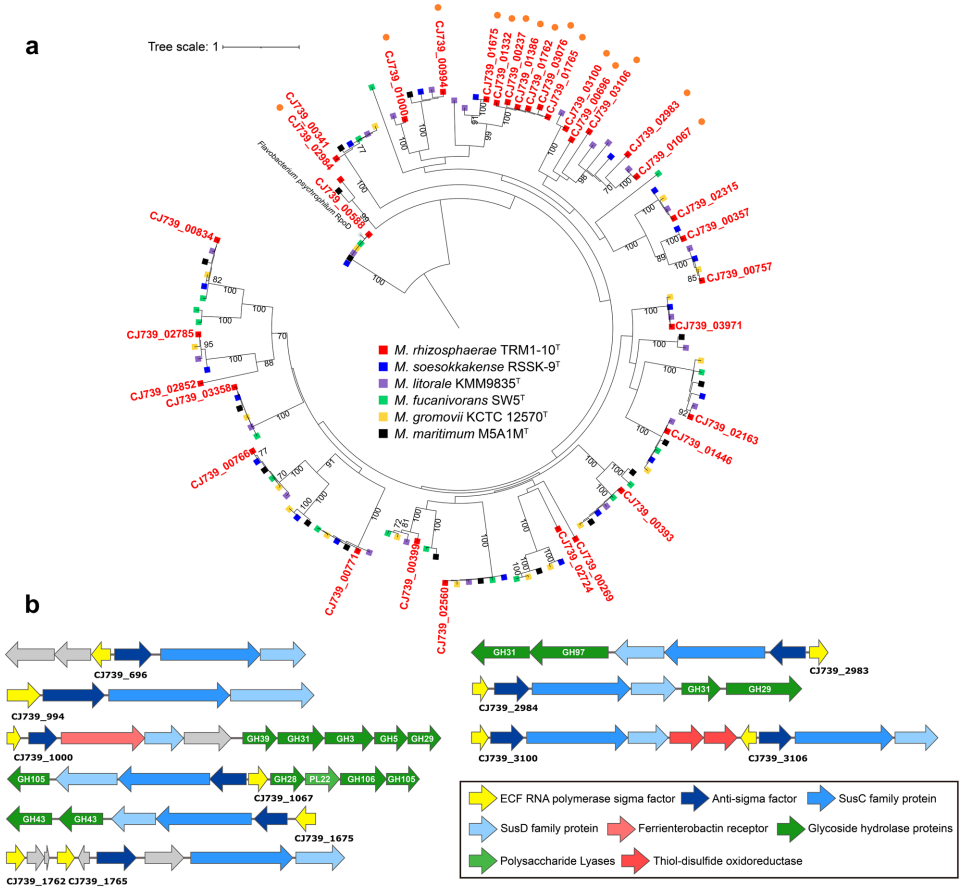 本研究针对番茄细菌性青枯病的防治难题,从抗病品种根际微生物组中成功分离出一株新型黄杆菌科细菌TRM1-10。通过多相分类学鉴定(包括生理生化、比较基因组及系统发育分析),研究人员确定其为Mariniflexile属的新物种,并命名为Mariniflexile rhizosphaerae sp. nov.。基因组分析揭示该菌株富含碳水化合物活性酶(CAZyme)、ECFσ因子(ECF240群)及纤维素生物合成相关基因,这些特征可能与其在根际环境的适应性及其通过预占病原菌(Ralstonia solanacearum)可利用糖源等方式抑制病害的能力密切相关。该研究为利用根际益生菌防治土传病害提供了新的菌种资源和理论依据。