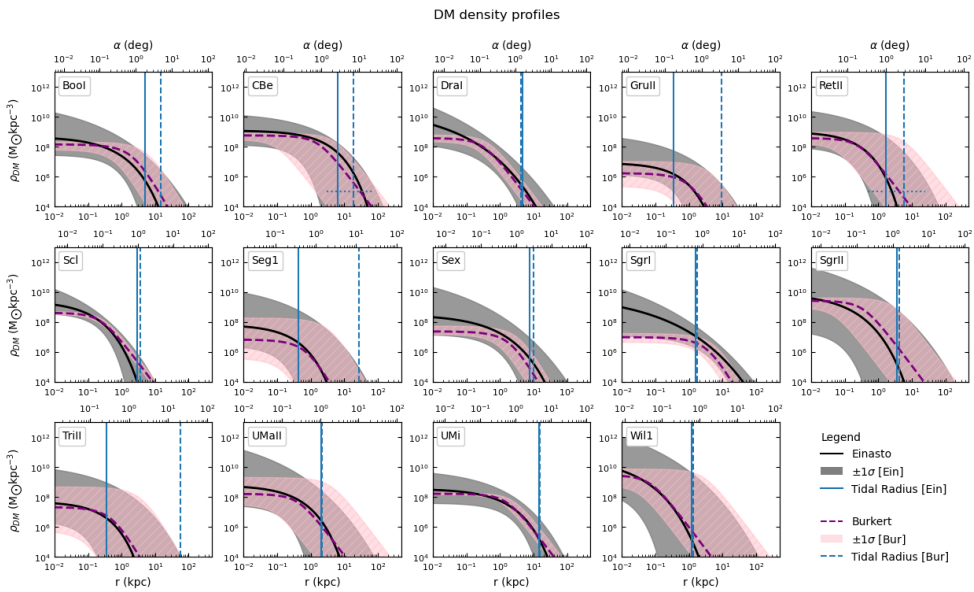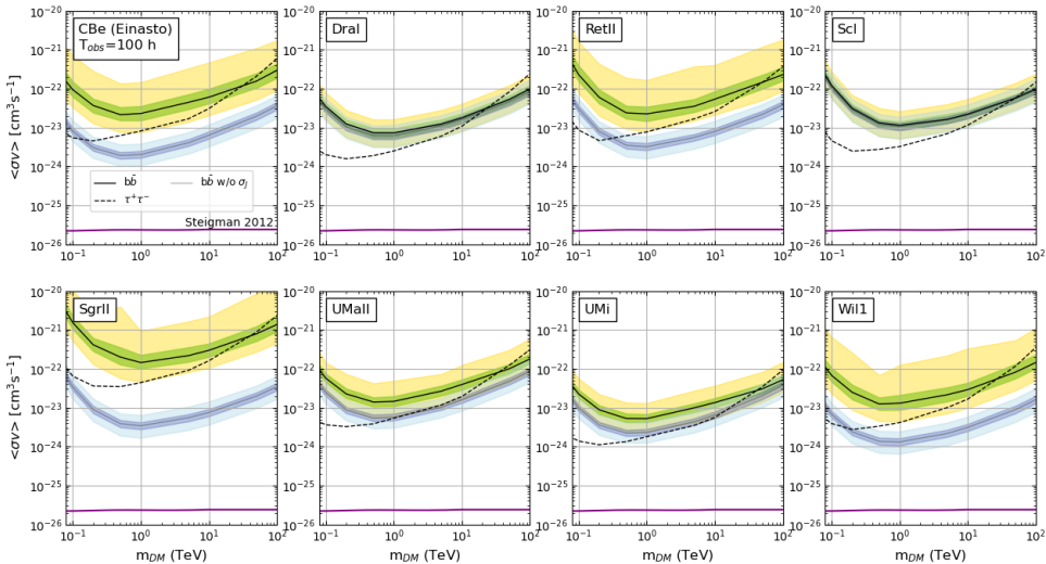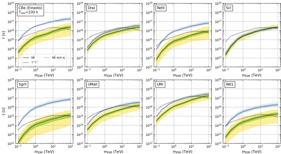 本研究针对暗物质(DM)粒子性质探测难题,利用下一代切伦科夫望远镜阵列(CTAO)对矮球状星系(dSphs)开展间接探测研究。通过CLUMPY代码对8个最优dSphs(如Draco I、Reticulum II等)的暗物质分布进行建模,计算得到Jann和Jdec天体物理因子。研究预测CTAO在600小时联合观测下,对WIMP湮灭截面的探测灵敏度可达〈σv〉~5×10-25 cm3 s-1(TeV质量区),对衰变寿命的灵敏度达τ~1028 s。该研究为TeV以上能区暗物质探测提供了迄今最灵敏的观测策略。