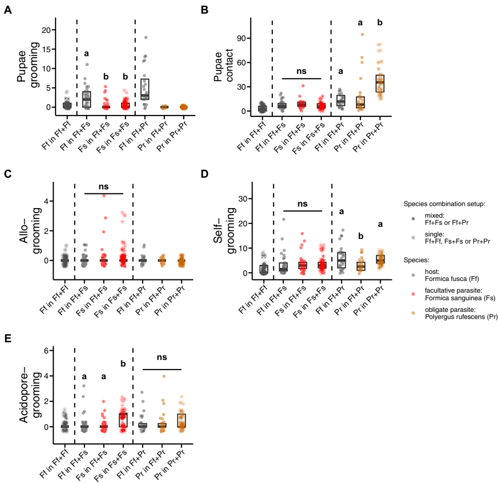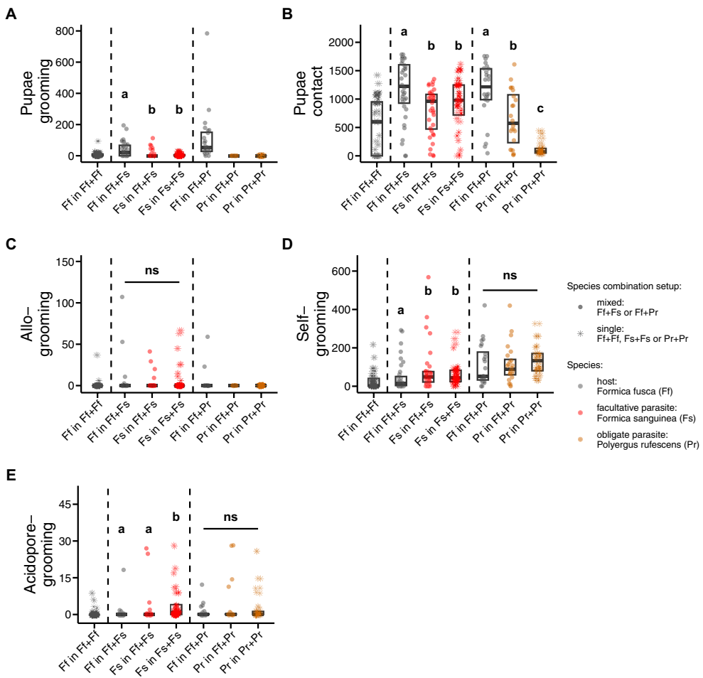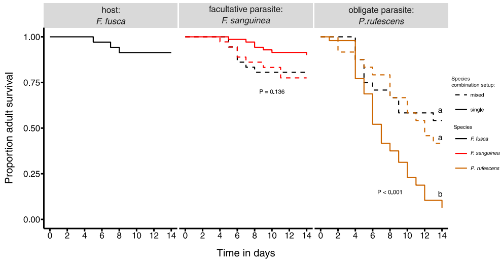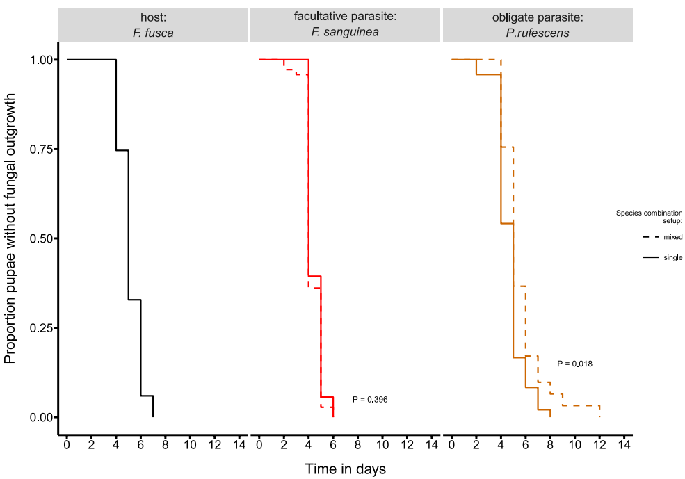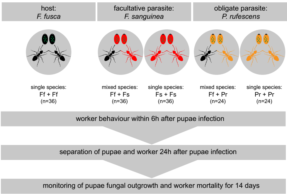本研究针对社会寄生蚂蚁在免疫防御策略上的演化机制展开探讨。研究人员通过比较专性寄生蚁Polyergus rufescens、兼性寄生蚁Formica sanguinea及其共同宿主Formica fusca对真菌病原体Metarhizium pingshaense的防御行为,发现寄生蚁通过剥削宿主免疫服务并调整自身防御投入来适应寄生生活史。实验表明P. rufescens完全丧失育幼护理能力而依赖宿主,F. sanguinea则保留条件性防御能力(如酸孔 grooming),揭示了社会寄生生活史驱动免疫防御性状演化的新机制。