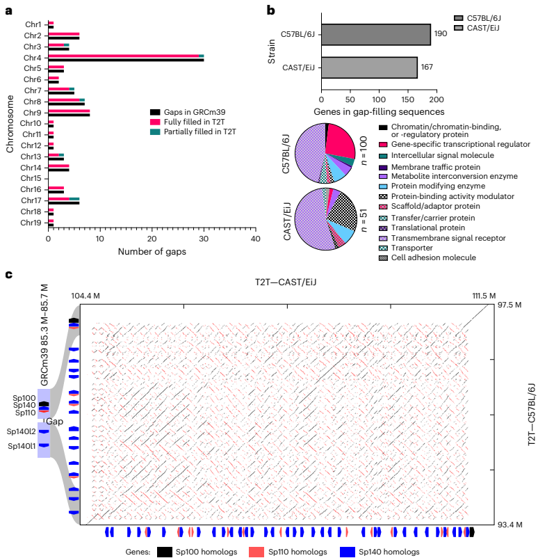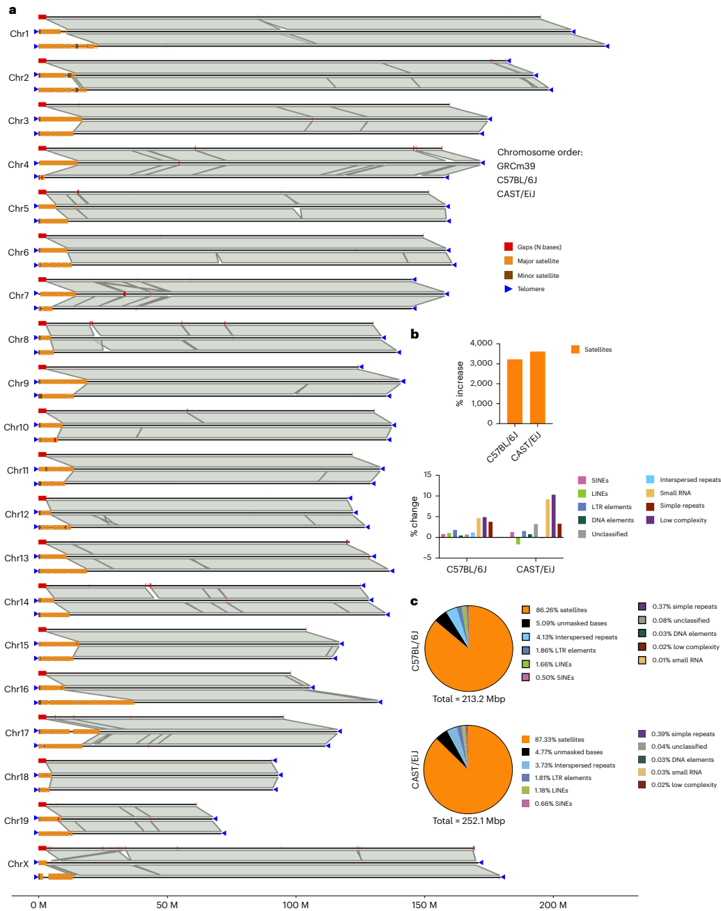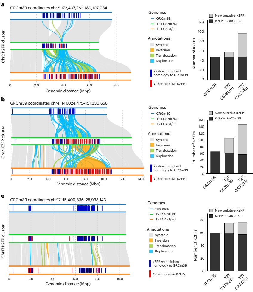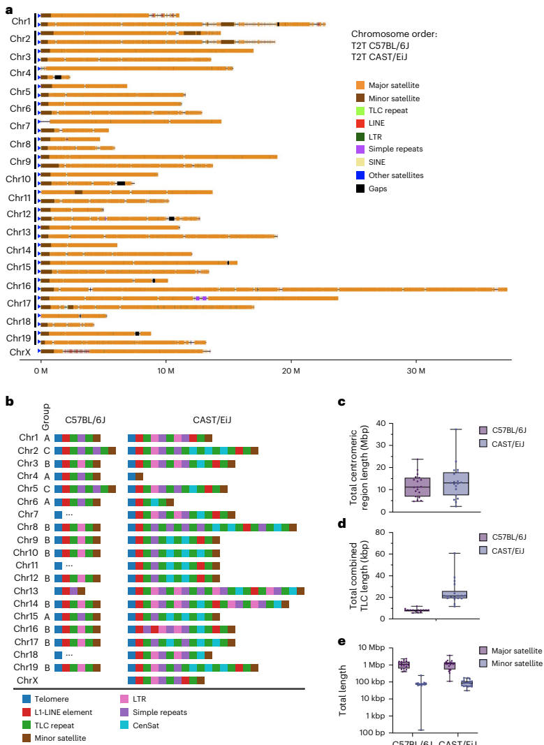 本研究针对当前小鼠参考基因组GRCm39存在281个序列缺口、缺乏完整端粒和着丝粒序列的问题,通过单分子超长测序技术完成了C57BL/6J和CAST/EiJ两个近交系小鼠的T2T(端粒到端粒)基因组组装。研究发现两个亚种在着丝粒大小(C57BL/6J中位值11.1 Mb,CAST/EiJ 12.9 Mb)和端粒相关重复序列结构存在显著差异,新增213 Mb序列包含517个蛋白质编码基因,并完整解析了假常染色体区(PAR)和KRAB锌指蛋白(KZFP)基因簇。该研究为哺乳动物染色体结构和进化研究提供了重要资源。