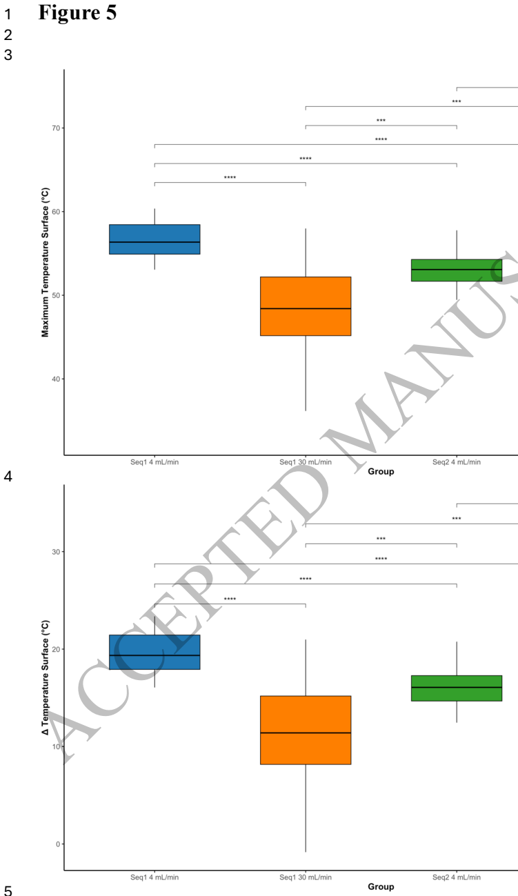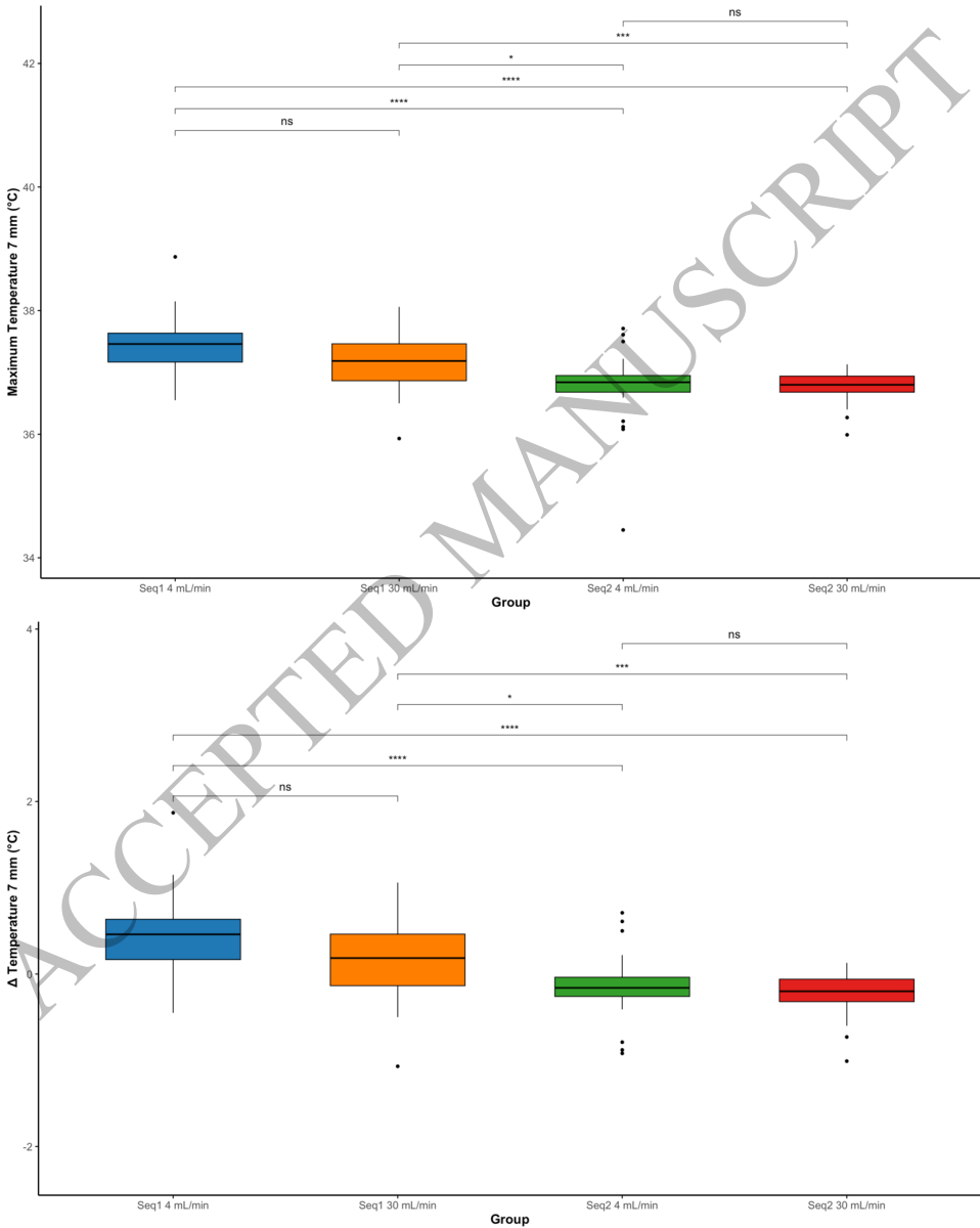 本研究针对脉冲电场消融(PFA)这一非热消融技术在临床应用中可能产生非忽视性热效应、增加血栓栓塞风险的问题,系统评估了可变环状圆形导管(VLCC)在不同波形配置(商业Sequence 1与实验性Sequence 2)和灌流速率(4 mL/min与30 mL/min)下的温度动力学特征。研究发现商业波形在低灌流时表面温度可达56.4°C,而优化波形结合高灌流可将温度显著降至40.8°C,证实通过波形优化和主动冷却可协同降低热负荷,为提升PFA安全性提供了重要循证依据。