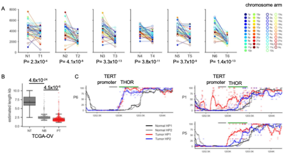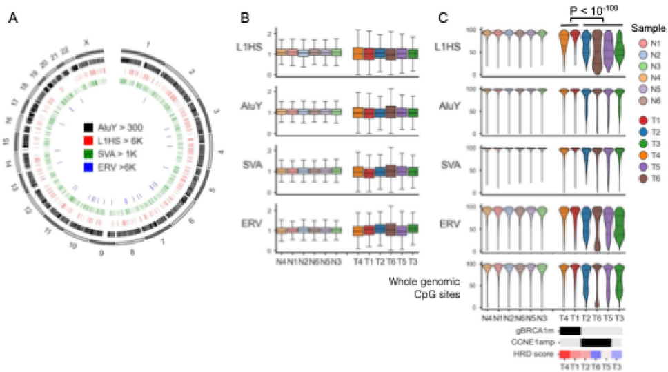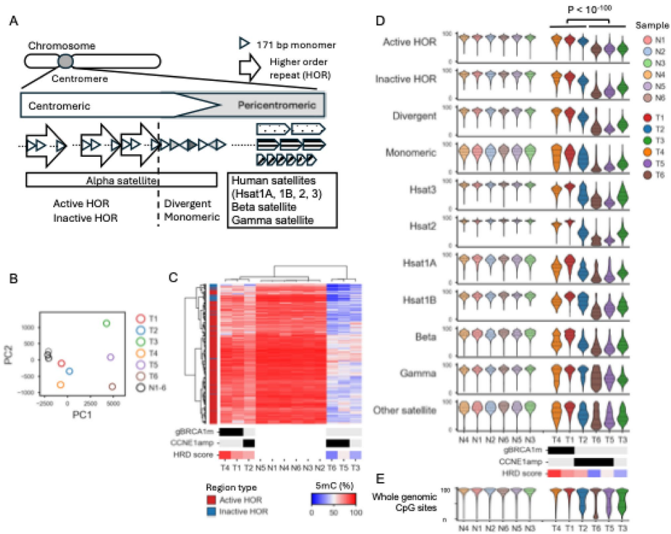 本研究针对高级别浆液性卵巢癌(HGSOC)中同源重组缺陷(HRD)对重复区域(如着丝粒和转座元件)的影响尚未明确的问题,采用牛津纳米孔长读长测序技术(LRS)结合T2T-CHM13参考基因组,首次在临床HGSOC样本中系统分析了着丝粒低甲基化、转座元件变异及端粒缩短等分子特征。结果发现HRD肿瘤与着丝粒特异性低甲基化模式显著相关,且LINE1/ERV元件的低甲基化程度与BRCA1突变状态相关,同时揭示了等位基因特异性TERT启动子超甲基化(THOR)可能作为端粒酶激活的新机制。该研究为HGSOC的分子分型提供了新视角,凸显了LRS在解析癌症重复基因组中的独特价值。
