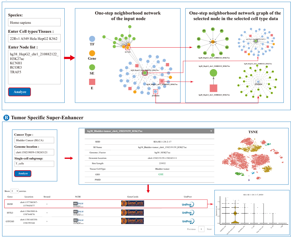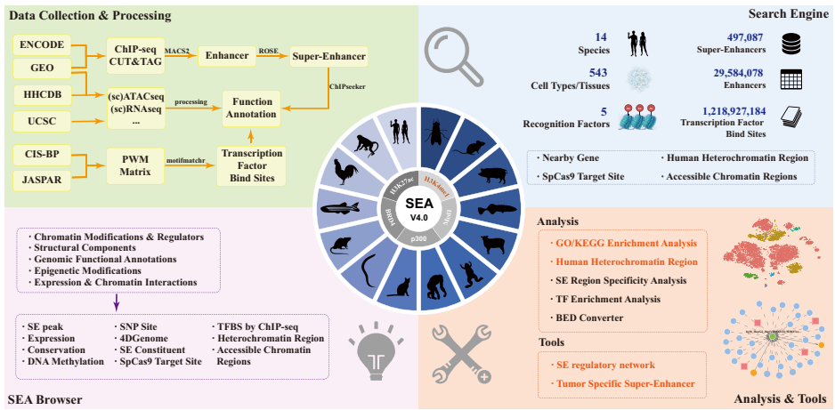 本研究针对超级增强子(SE)研究领域存在的数据分散、注释不全面、缺乏跨物种比较和肿瘤特异性分析工具等问题,开发了SEA version 4.0平台。研究人员整合了截至2024年12月的多组学数据,基于H3K27ac、BRD4、p300、Med1及新增的H3K4me1等5种标志物,在14个物种的543种细胞/组织中系统鉴定了496,071个SE和29,584,078个增强子。该平台提供了全面的基因组注释、功能富集分析、基于香农熵的SE特异性鉴定、交互式调控网络构建以及利用12种癌症scRNA-seq数据的肿瘤特异性SE探测工具。SEA 4.0通过标准化流程显著提升了数据质量和比较可靠性,为解码SE在发育和疾病中的机制提供了不可或缺的资源。