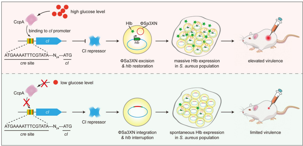 本研究针对金黄色葡萄球菌前噬菌体Sa3int家族的生命周期调控机制这一科学问题,通过发现葡萄糖通过CcpA-cI通路调控ΦSa3XN活性溶原性转换的新机制,揭示了高血糖环境下细菌毒力增强的分子基础,为理解糖尿病易感金黄色葡萄球菌感染提供了新的理论依据。