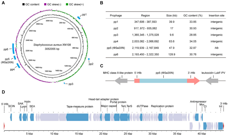P<0.001.(E) Hemolytic activity of XN108 and derivatives. Data are the mean±SD from three independent replicates and determined by one-way ANOVA with Tukey's multiple comparisons test,*P<0.0001.(F) Representative hemolysis of XN108 and derivatives cultured on Columbia blood agar.△Sa3XN forms a clear hemolytic ring.(G) SDS-PAGE analysis of whole exoproteins from overnight cultures of XN108 and△Sa3XN.The red arrow indicates the band between 35 and 40 kDa that was present in△Sa3XN but not in XN108.(H) Western blot analysis for Hlb expression in XN108 and△Sa3XN.Representative gel is shown from three inde-pendent experiments.LC:loading control.(I)TEM analysis for overnight culture supernatants of XN108 and DDSa3XN that treated with 1μg/mL MMC.No obvious difference for phage particles was detected between XN108 and△DSa3XN'>