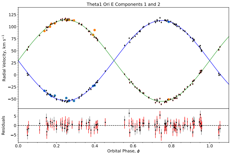 本研究针对猎户座梯形星群中年轻的中质量前主序双星θ1 Ori E,通过长达15年的高分辨率光谱观测,精确测定了其轨道参数、质量比(q=0.9856±0.0047)、有效温度(Teff=5150±200 K)及同步自转状态(v sin i=32±3 km s-1)。结合Spitzer光变曲线,研究人员首次以优于2%的精度确定双星组分质量(M1=2.755±0.043 M⊙, M2=2.720±0.043 M⊙),并推断其年龄≤105年,为检验大质量前主序恒星演化模型提供了关键基准。