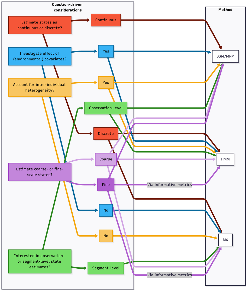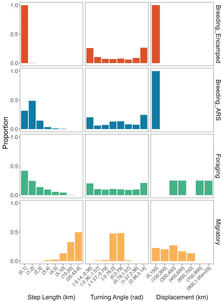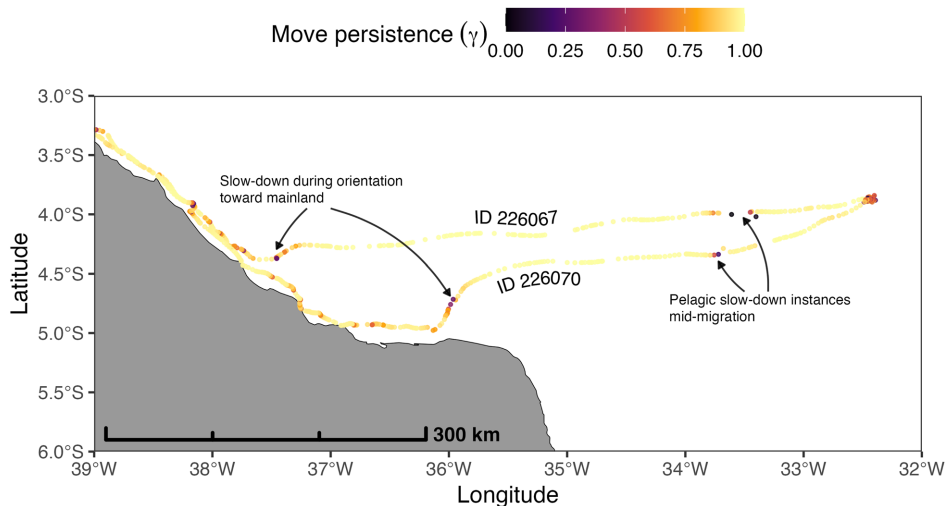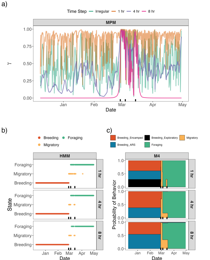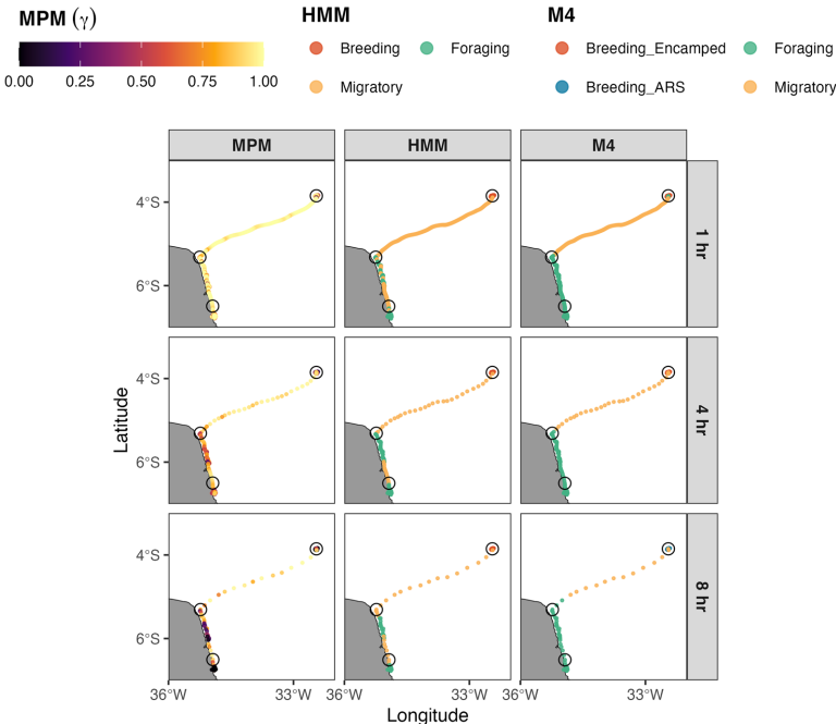 本研究针对动物运动数据分析中行为状态估计方法选择的难题,比较了移动持续性模型(MPM)、隐马尔可夫模型(HMM)和混合成员运动方法(M4)在分析绿海龟(Chelonia mydas)遥测数据时的表现。研究发现不同统计方法和时间尺度会显著影响行为状态估计结果,其中HMM和M4在8小时时间步长能有效区分区域限制搜索(ARS)与迁徙行为,而MPM在1小时短时间尺度能识别迁徙过程中的精细行为模式。该研究为动物运动生态学研究的方法选择提供了重要指导,对提高生态学推论的准确性具有重要意义。