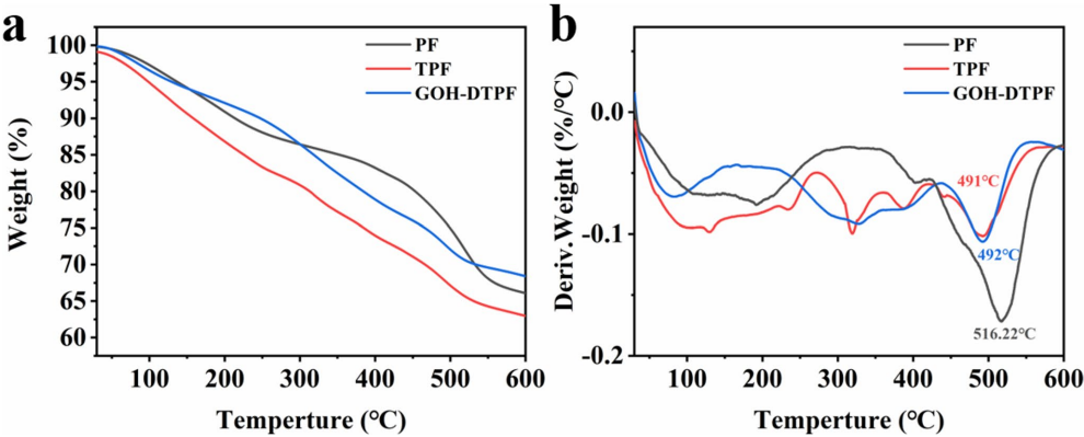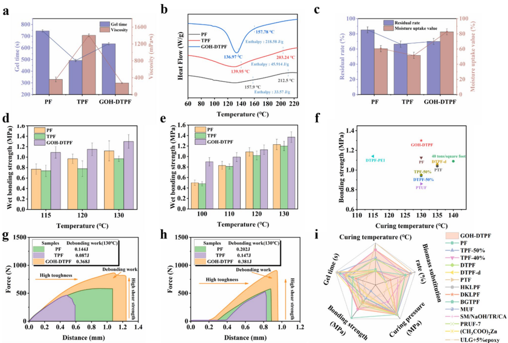 本研究针对传统酚醛树脂(PF)存在固化温度高、脆性大以及原料苯酚具有毒性和不可再生等问题,创新性地提出了一种部分生物基策略。研究人员首次利用羟基化石墨烯(G-OH)作为绿色亲核试剂,在酸性湿法球磨条件下解聚马占相思单宁(AMT),成功制备了羟基化石墨烯功能化解聚单宁(GOH-DAMT),并用其替代50%的苯酚合成了新型生物基酚醛树脂(GOH-DTPF)。研究结果表明,该方法将单宁的平均聚合度从9显著降低至2,使得GOH-DTPF树脂的初始固化温度从157.9°C降至136.9°C,固化速度加快。同时,树脂的湿态粘结强度在130°C固化时达到1.30 MPa,较传统PF树脂(1.12 MPa)提升16.1%,并且粘附功提升了155%,表现出优异的韧性和强度。该研究为开发可持续、高性能的生物基酚醛树脂提供了新思路,在木质复合材料等领域具有广阔应用前景。