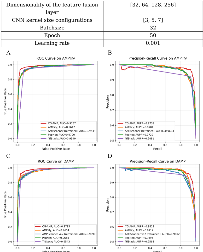 本研究针对抗生素耐药性日益严重的公共卫生挑战,开发了一种基于深度学习的抗菌肽(AMP)识别新工具——CG-AMP。该框架创新性地结合了预训练语言模型(ESM-2)的语义特征与包含进化信息(BLOSUM62)和理化性质(Z-scale)的多维手工特征,通过对比学习模块和门控卷积神经网络(GCNN)双模块架构进行高效特征提取与融合。在AMPlify和DAMP独立测试集上,CG-AMP的准确率分别达到0.9497和0.9403,马修斯相关系数(MCC)分别为0.8994和0.8812,显著优于现有主流方法,为加速新型抗菌肽的发现提供了可靠的计算解决方案。