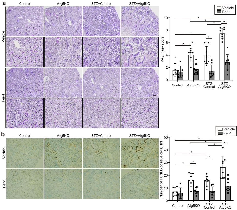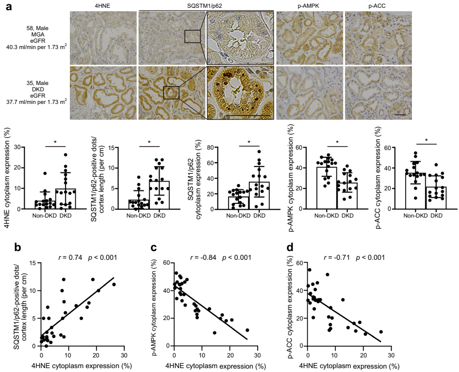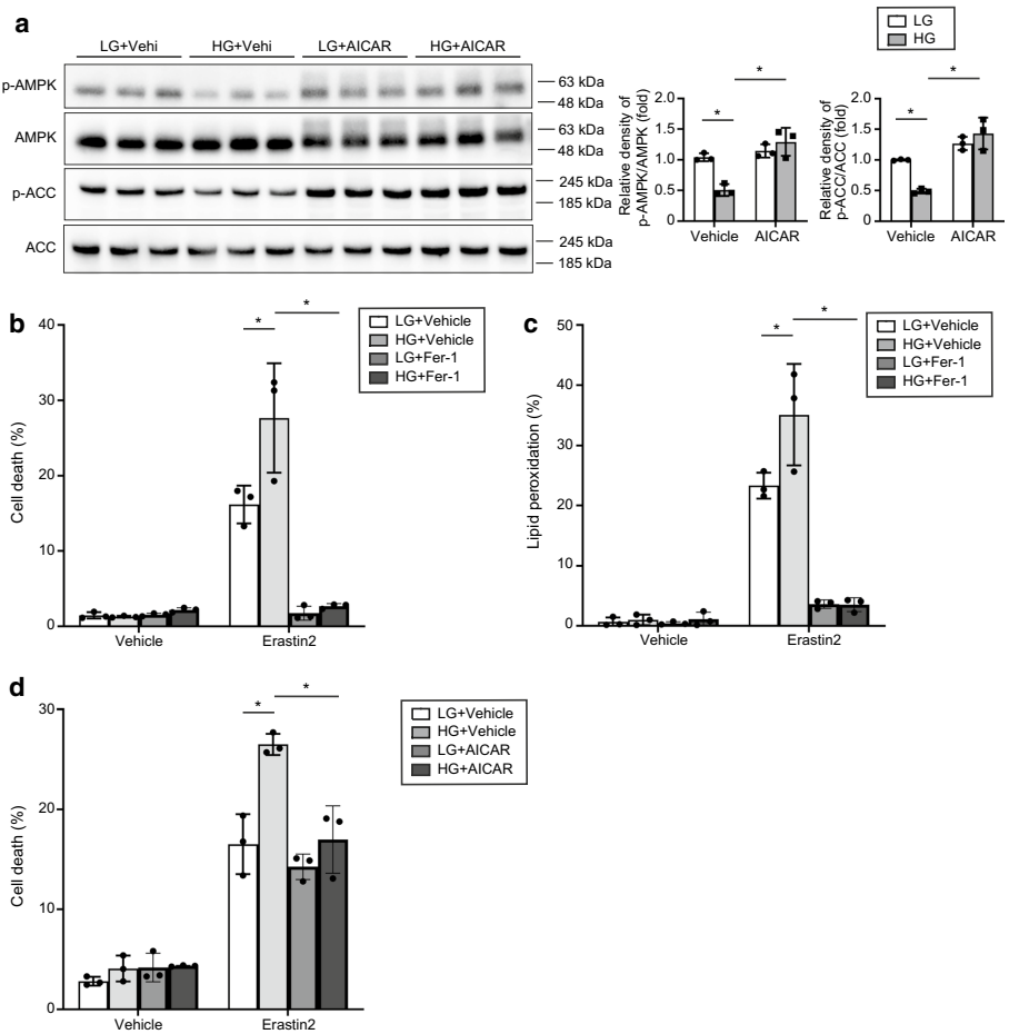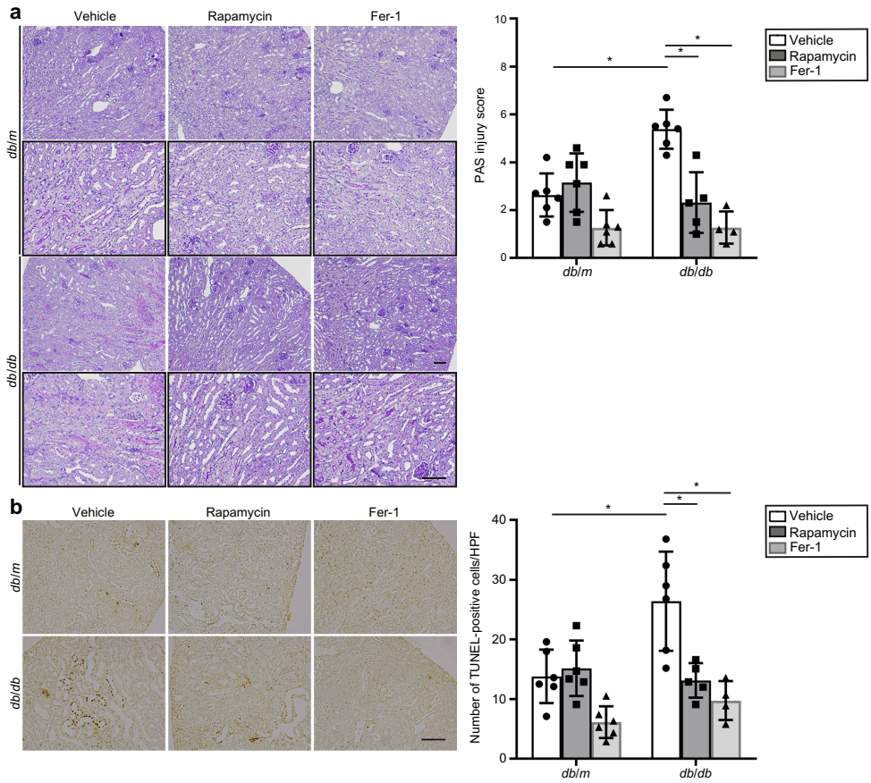 本研究针对糖尿病肾病(DKD)患者急性肾损伤(AKI)易感性增高的临床问题,聚焦于近端肾小管上皮细胞(PTECs)中铁死亡(ferroptosis)的作用机制。研究人员通过分析人肾活检标本及构建1型(STZ诱导)和2型(db/db)糖尿病小鼠模型,发现DKD中自噬(autophagy)受损和AMP激活蛋白激酶(AMPK)信号失活显著增强了PTECs对铁死亡的敏感性。机制上,自噬缺陷通过升高线粒体活性氧(ROS)促进铁死亡,而高糖(HG)环境则通过抑制AMPK-乙酰辅酶A羧化酶(ACC)轴加剧这一过程。使用自噬增强剂雷帕霉素或AMPK激动剂AICAR干预可有效减轻糖尿病肾脏的铁死亡及相关损伤。该研究揭示了糖尿病肾病中铁死亡的新调控通路,为开发以自噬和AMPK为靶点的肾脏保护策略提供了理论依据。