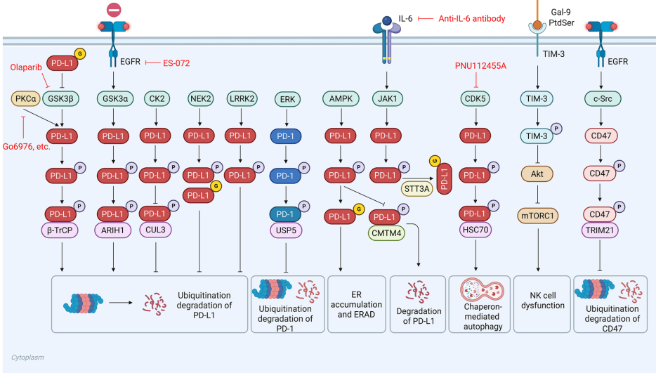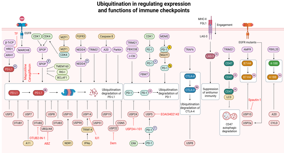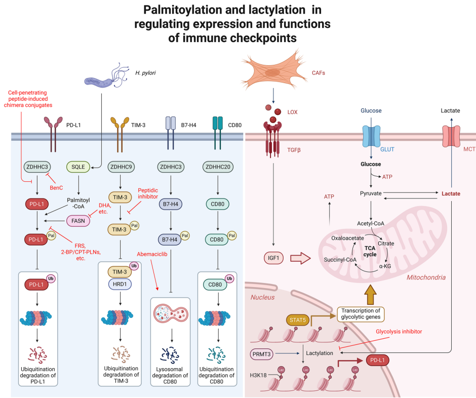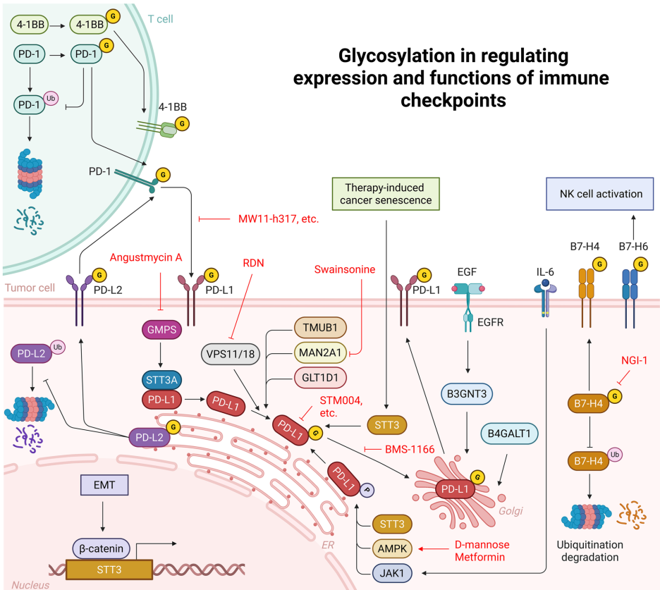 免疫检查点抑制剂(ICIs)如抗CTLA-4和抗PD-1/PD-L1抗体已变革癌症治疗,但低应答率和耐药性仍是挑战。蛋白翻译后修饰(PTMs)通过调控免疫检查点的表达、定位和功能,显著影响免疫治疗效果。本文综述了PTMs对免疫检查点的调控机制及靶向策略。