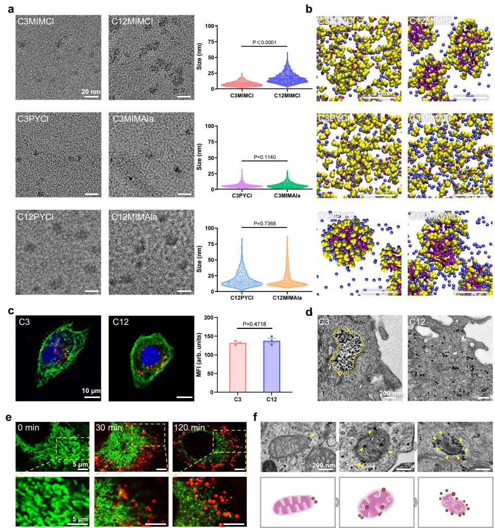 中国科学院过程工程研究所(Institute of Process Engineering, Chinese Academy of Sciences)的研究团队在《Nature Communications》发表的研究,通过构建包含61种ILs的模块化库,首次揭示了阳离子烷基链长度(C)是决定ILs生物相容性的关键因素。研究发现短链ILs(scILs)和长链ILs(lcILs)在水溶液中均会形成纳米聚集体,但两者在细胞内的命运截然不同:scILs被限制在囊泡内保持惰性,而lcILs能突破膜屏障靶向线粒体,通过破坏线粒体膜电位诱发线粒体自噬和凋亡。这种"纳米尺度分道扬镳"的现象,在从细胞系、类器官到小鼠、犬类等多层次实验模型中均得到验证。