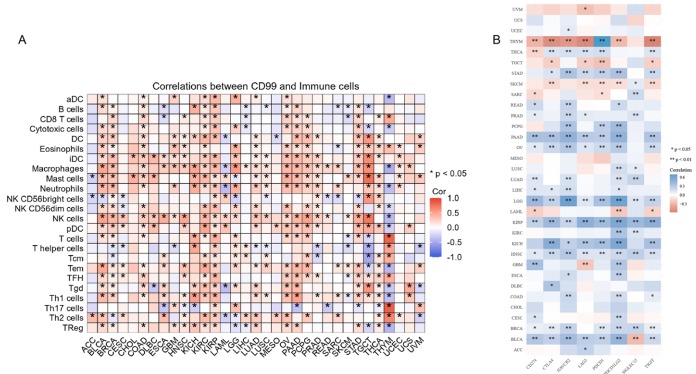 分析显示CD99与24种免疫细胞的浸润程度广泛相关,尤其在LAML中与CD8+ T细胞和NK细胞呈显著负相关。更关键的是,其表达与PD-1、CTLA-4等免疫检查点分子存在协同调控关系,这种"免疫调节器"特性在STAD等实体瘤中尤为突出。