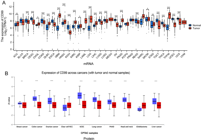 通过分析10,535例样本数据,发现CD99在胶质母细胞瘤(GBM)和肾透明细胞癌(RCC)等肿瘤中呈现显著高表达,而在乳腺癌和结肠癌中低表达。蛋白水平检测进一步验证了这种组织特异性分布规律。