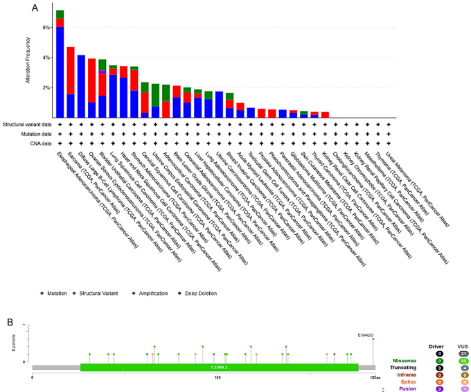食管腺癌中以6.04%的频率出现CD99深度缺失突变,肉瘤中则多见扩增型变异。引人注目的是,CD99表达与ACC肿瘤突变负荷(TMB)呈正相关,而在头颈鳞癌(HNSC)中呈负相关,提示其可能参与不同肿瘤的基因组稳定性调控。