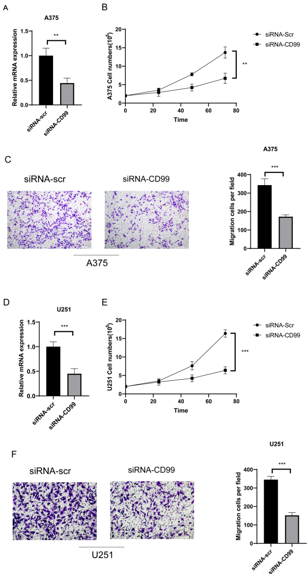 药物敏感性分析发现CD99高表达导致5-氟尿嘧啶(5-FU)和belinostat耐药,但对17-AAG等药物敏感性增加。功能实验证实沉默CD99可显著抑制黑色素瘤细胞系A375和胶质瘤U251细胞的迁移能力。