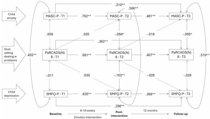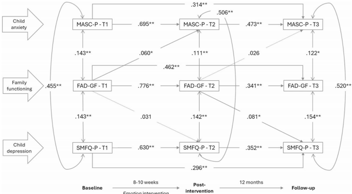 研究采用三阶段纵向设计(基线T1-干预后T2-12月随访T3),通过交叉滞后模型分析父母报告数据。核心工具包括:评估父母症状的HSCL-10(ω=0.88)、家庭功能FAD-GF(ω=0.86)、养育实践PaRCADS(N)(含情绪管理/目标设定/负面情绪应对3维度,ω=0.54-0.71)及儿童症状MASC-P/SMFQ-P(ω=0.90)。样本来自挪威58所公立学校的650名8-12岁高风险儿童(MASC-C≥54-61分,SMFQ-C≥7分)。