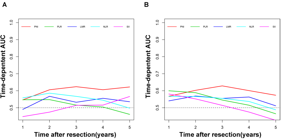 PNI展现出最优的预测性能:OS的C-index达0.594,显著优于PLR(0.511)和SII(0.505)。时间依赖性ROC分析显示,PNI在1年、3年和5年OS预测中的AUC分别为0.546、0.624和0.622,同样优于其他标志物。在RFS预测方面,PNI同样保持领先优势(C-index=0.570)。
