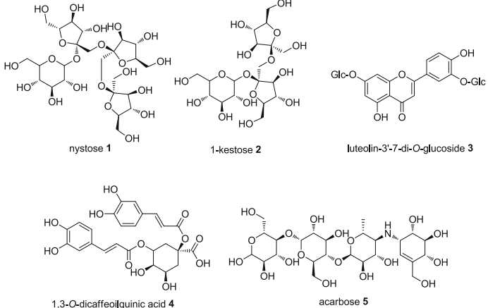 Smallanthus sonchifolius叶片中的1,3-O-二咖啡酰奎宁酸(4)以-115.657 kcal/mol结合α-葡萄糖苷酶,媲美阿卡波糖(-115.774 kcal/mol)。